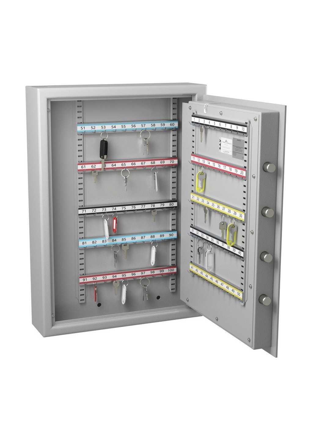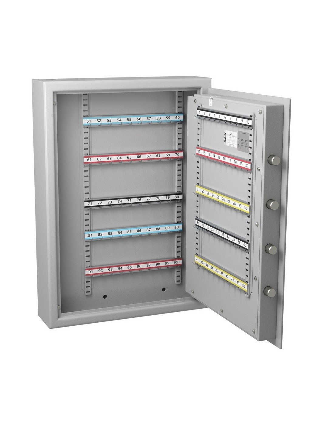 Le modèle Clés Protect 100 est de structure blindée au manganèse et entièrement construit en acier 1er choix. Elle dispose des rails d'accrochage réglable sur crémaillères, et pour plus de rapidité, elle dispose d’une trappe de dépôt clés avec chicanes anti-pêches,