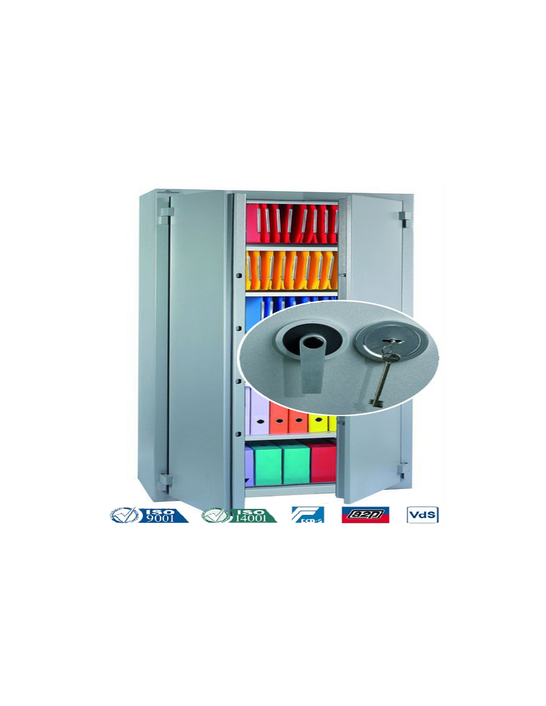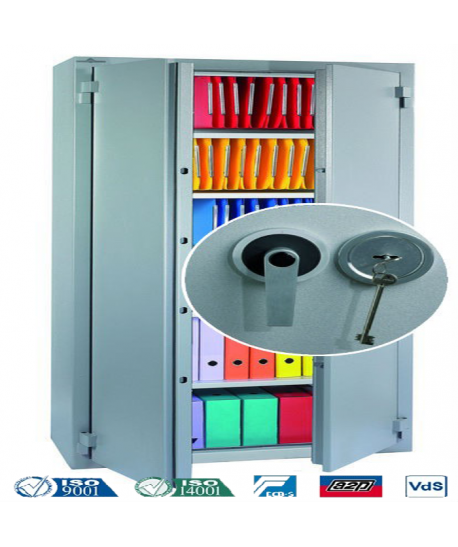 La performance des matériaux réfractaires aux normes DIN 4102 ralentit considérablement la monté de la température interne. Lors d’un incendie le joint se dilate de 10 fois son volume pour assurer une parfaite étanchéité aux flammes, au gaz, à l’aspersion et à la chaleur. Doubles parois assurent une protection anti-effraction extrêmement efficace. Corps indéformable et monobloc sans trace d’assemblage ni soudure. Épaisseur 30 mm. Verrouillage actif par pênes de condamnation tournants anti-sciage Ø 25 mm. Blindage des organes de condamnation par plaque d'acier au manganèse anti-perçage. Un trous de scellement à la base diamètre ø14mm. Coloris gris RAL 9006.