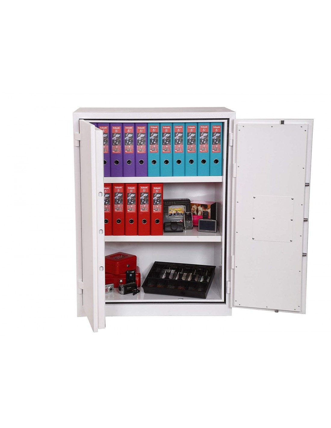 Cette armoire forte antivol et anti-feu est fournie avec 2 étagères réglables en hauteur qui incluent également des rails de suspension pour les dossiers latéraux en standard.