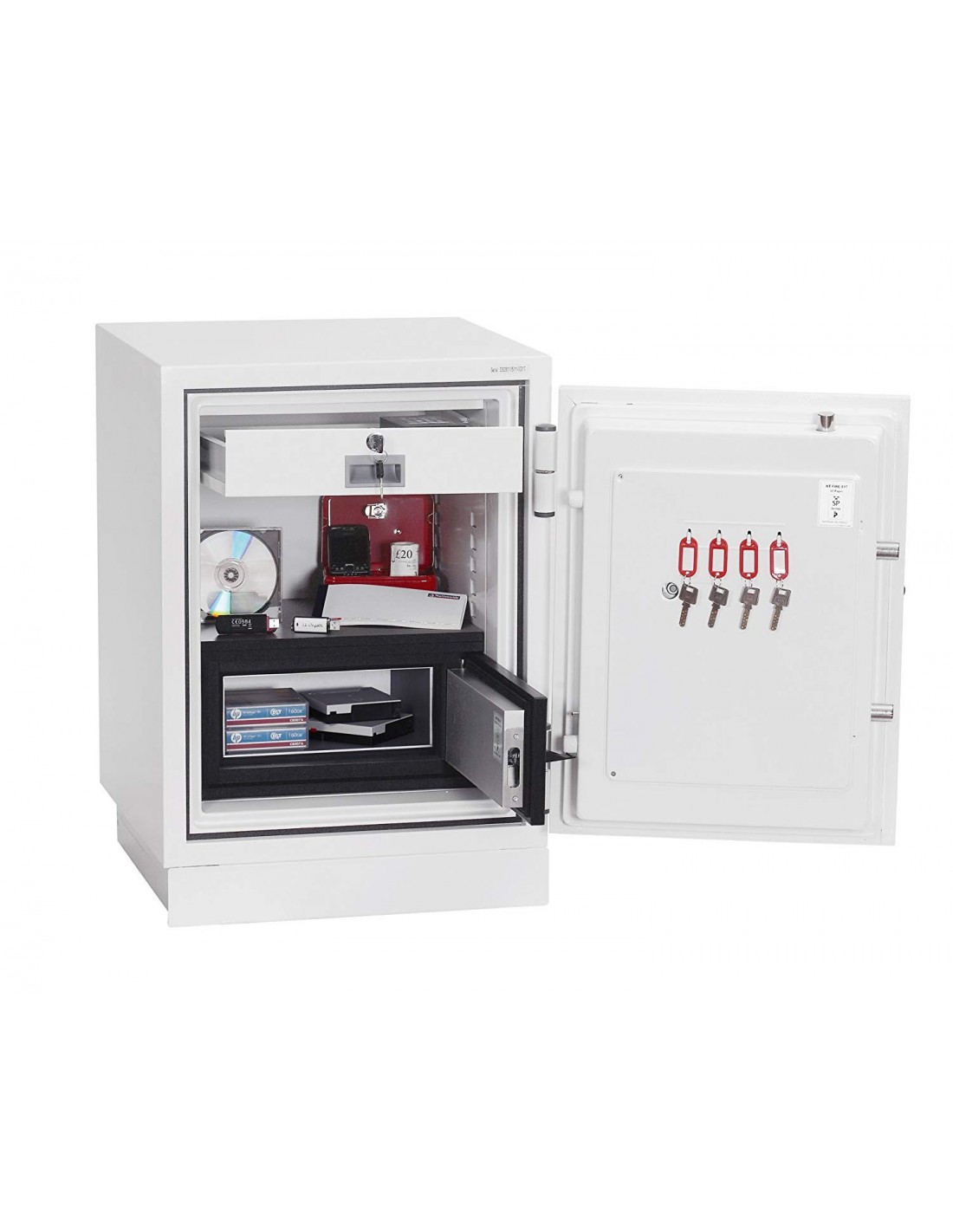 Ce coffre fort présente en fait, 4 coffres forts en 1, grâce à ses caractéristiques techniques qui assemblent les meilleurs critères de sécurité. Ce coffre fournit une protection contre le feu pour les documents papier, les sauvegardes informatiques, média Digital (DVD, données de mémoire) et de sécurité pour l’argent liquide et les objets précieux.