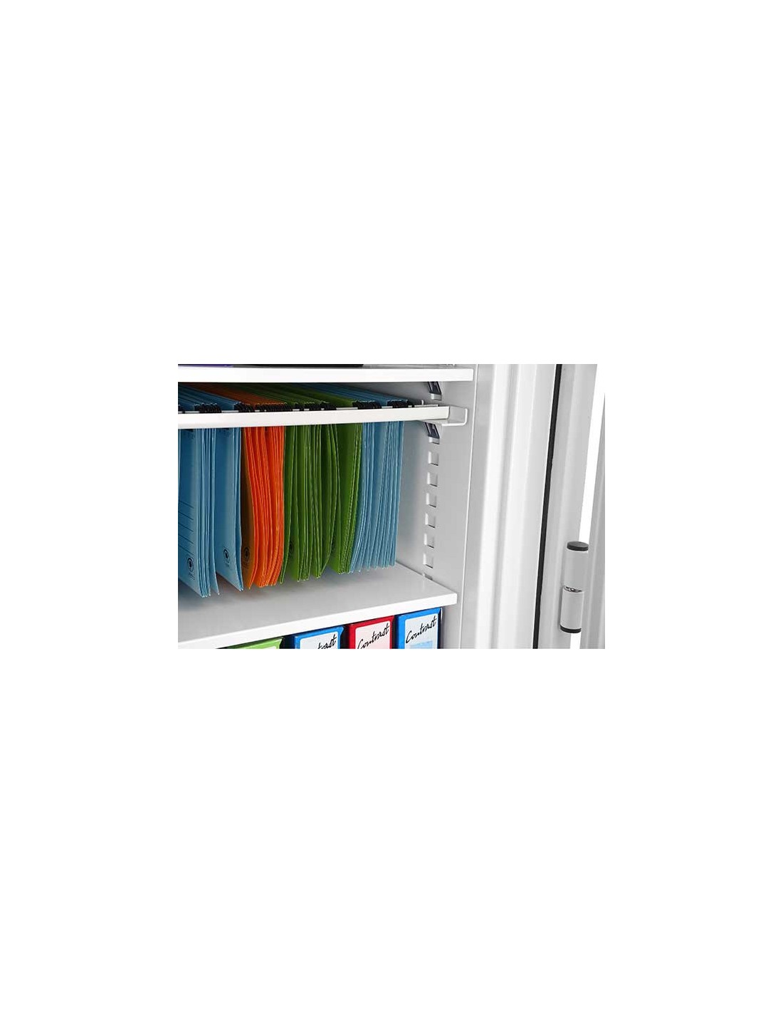Cette armoire forte antivol et anti-feu est fournie avec 2 étagères réglables en hauteur qui incluent également des rails de suspension pour les dossiers latéraux en standard.