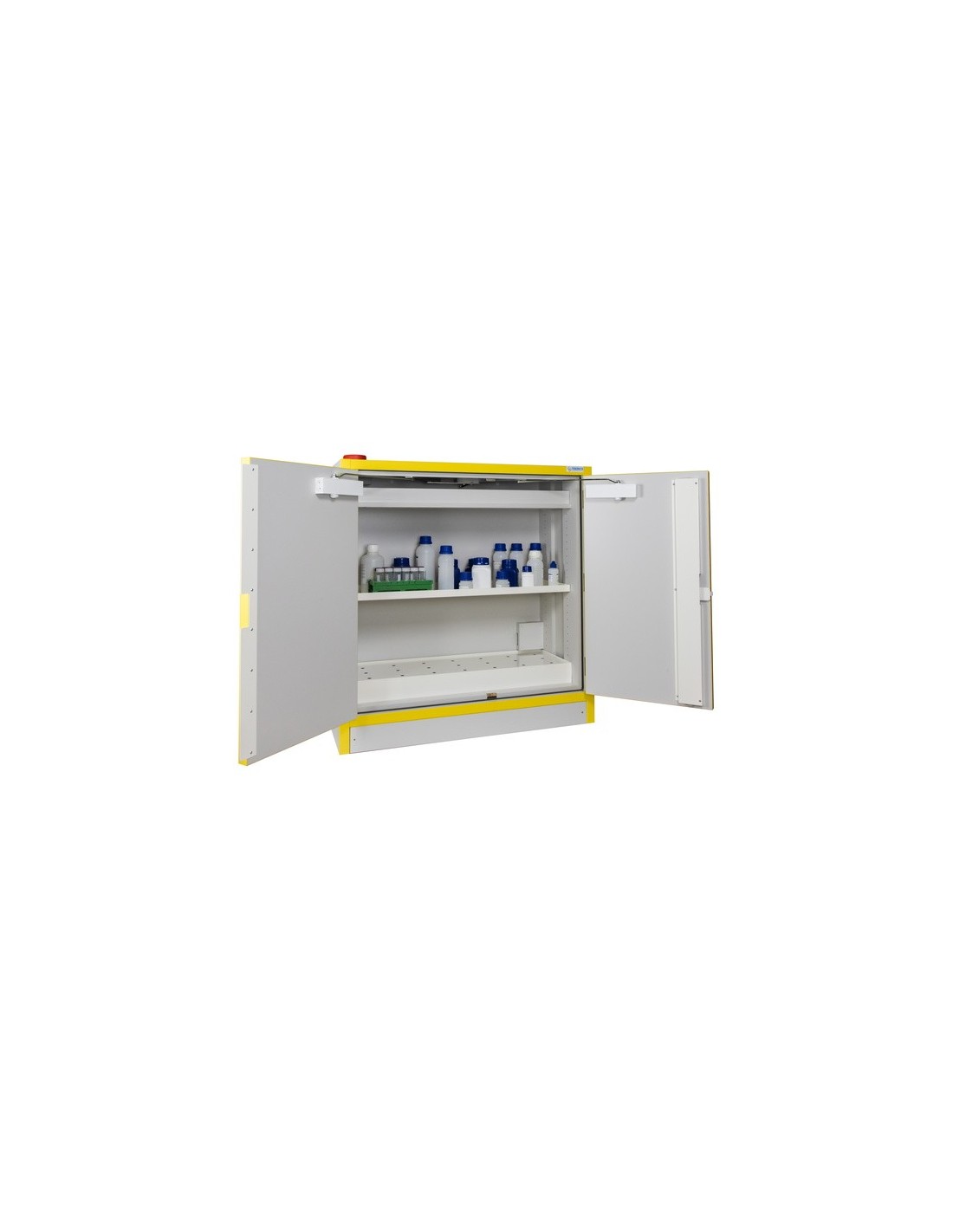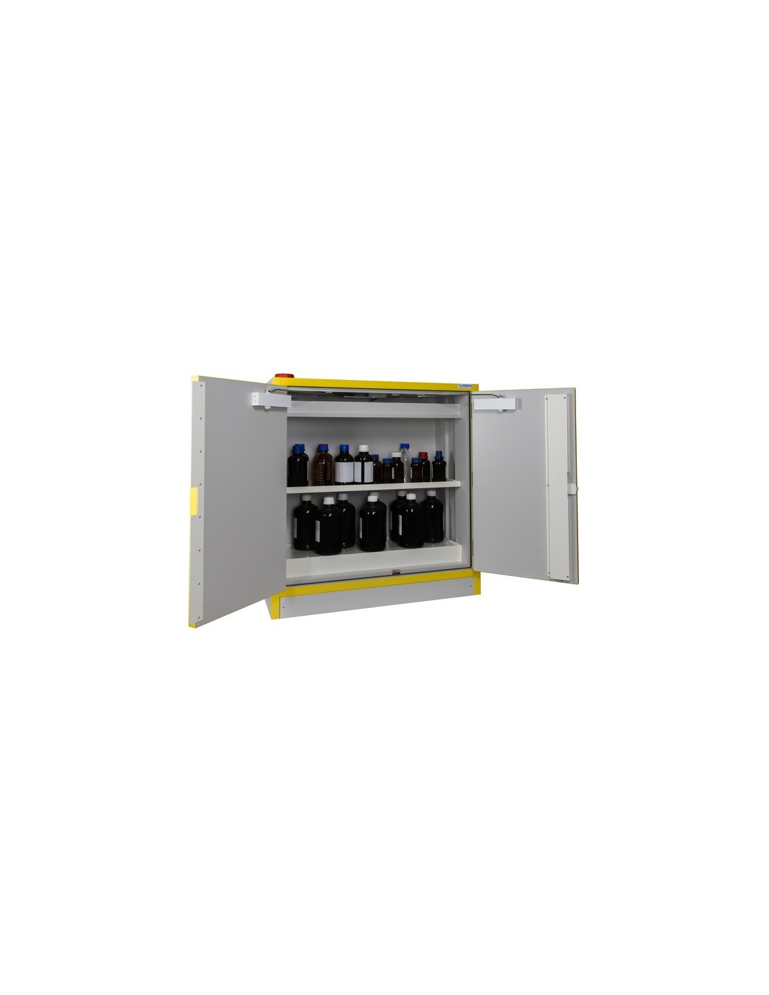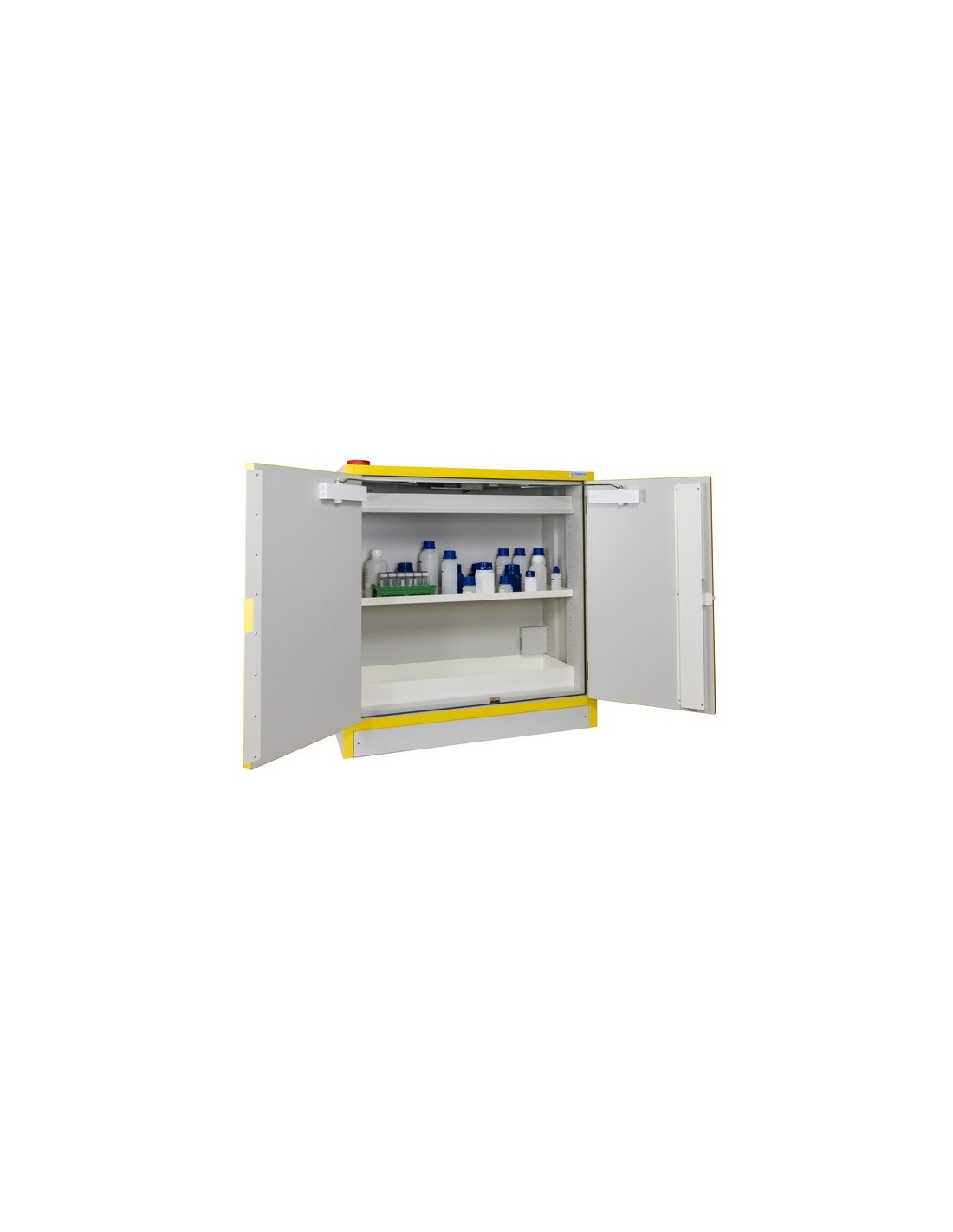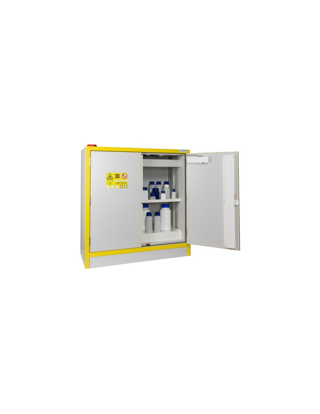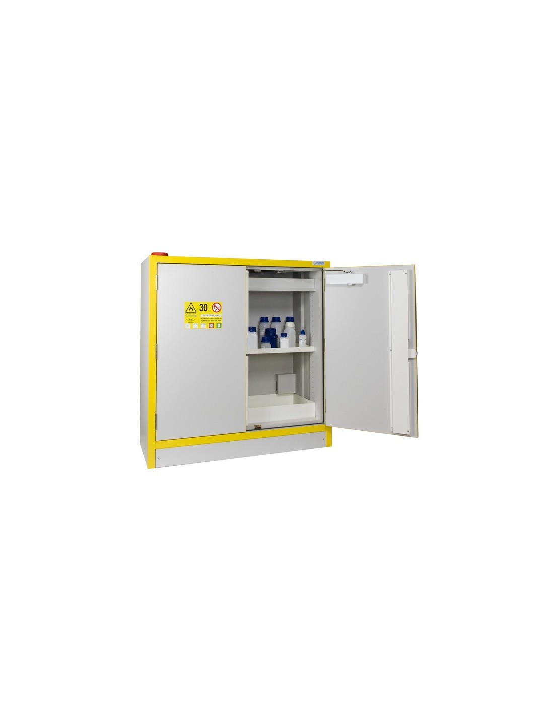 Référence 3033UE Conformité EN 14470-1, FM 6050 Construction de l'armoire bois mélaminé Couleur des portes gris clair RAL 7035 Nombre de porte(s) 2 Type de porte(s) battantes Charnières droite et gauche Fermeture de(s) porte(s) automatique Diamètre de ventilation (mm) 100 Nombre de compartiment(s) 1 Etagère(s) 1 Sur-étagère(s) en PVC Option Bac(s) de rétention 1 Bac(s) de rétention en PVC Option Caillebotis Option Capacité de rétention (L) 31 Dimensions extérieures H x L x P (mm) 1198 x 1115 x 630 Dimensions intérieures H x L x P (mm) 1198 x 1092 x 537 Dimensions à l'expédition H x L x P (mm) 2180 x 1200 x 800 Charge admissible 50 Capacité de stockage (L) 130 Poids (kg) 170.00 Code douanier 94036000
