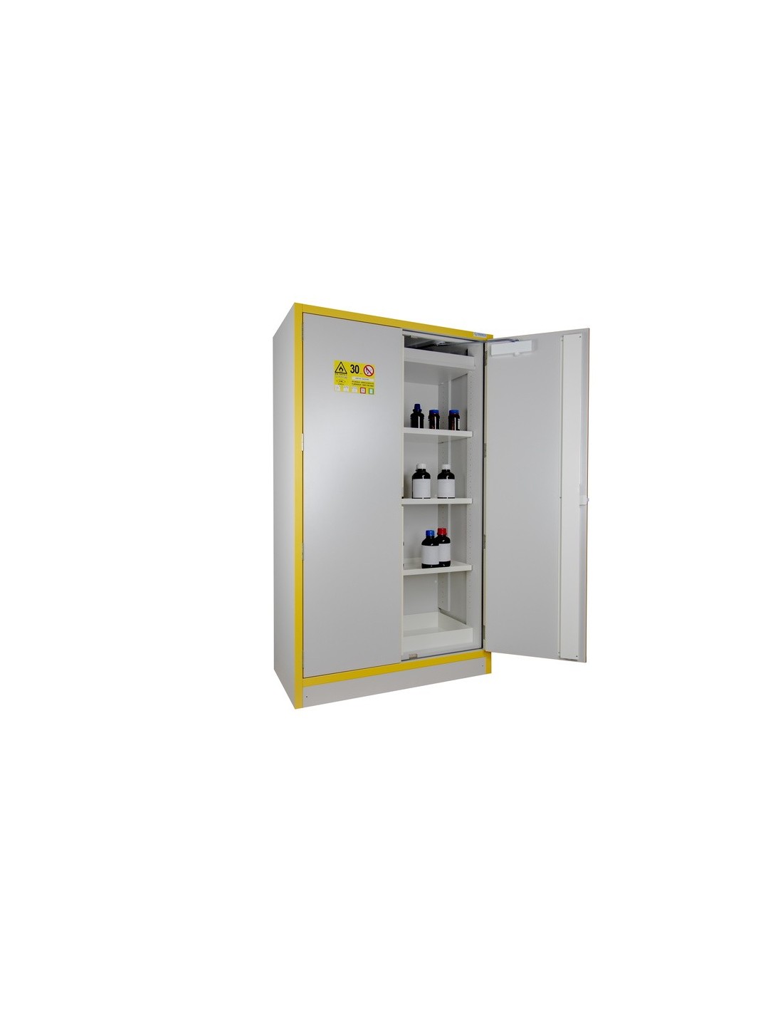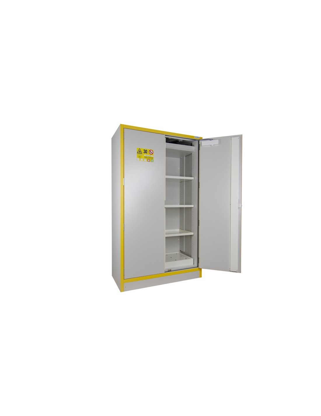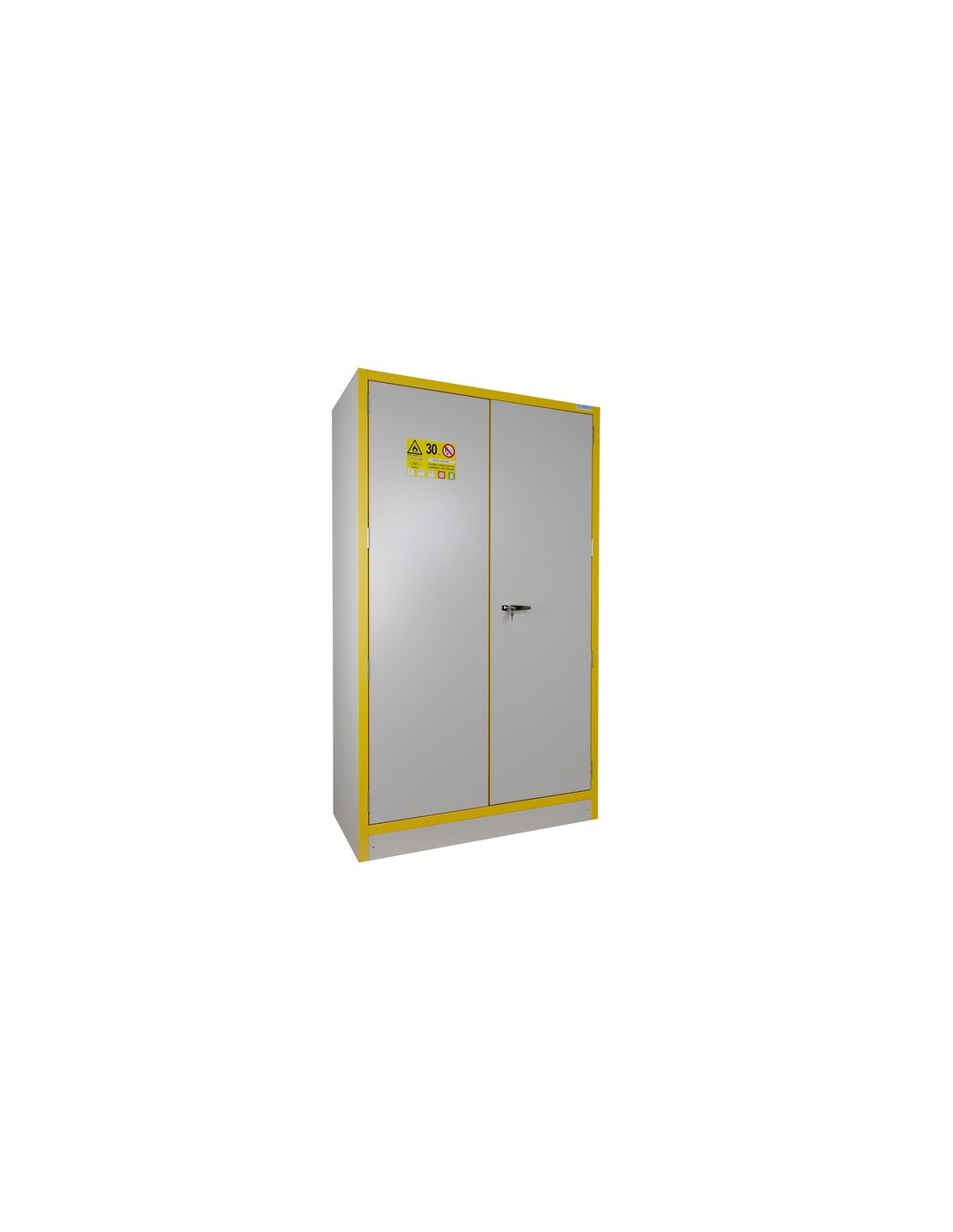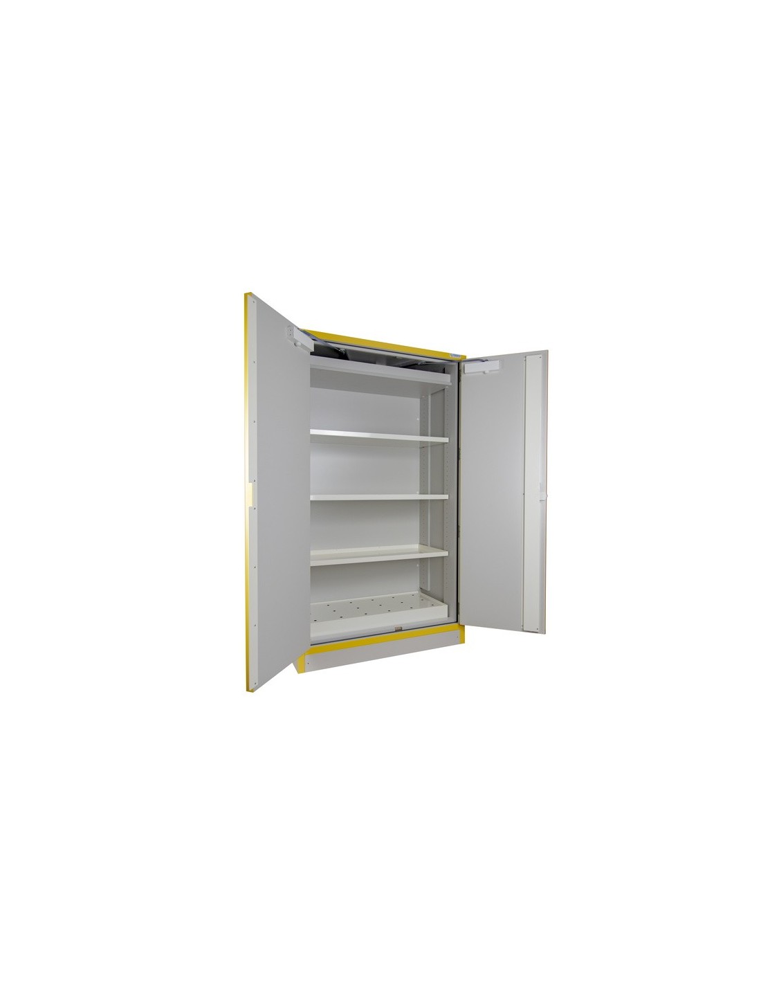 Référence 3035E Conformité EN 14470-1, FM 6050 Construction de l'armoire bois mélaminé Couleur des portes gris clair RAL 7035 Nombre de porte(s) 2 Type de porte(s) battantes Charnières droite et gauche Fermeture de(s) porte(s) automatique Diamètre de ventilation (mm) 100 Nombre de compartiment(s) 1 Etagère(s) 3 Sur-étagère(s) en PVC Option Bac(s) de rétention 1 Bac(s) de rétention en PVC Option Caillebotis Option Capacité de rétention (L) 41 Dimensions extérieures H x L x P (mm) 1980 x 1115 x 550 Dimensions intérieures H x L x P (mm) 1581 x 1001 x 419 Dimensions à l'expédition H x L x P (mm) 2200 x 1200 x 800 Charge admissible 50 Capacité de stockage (L) 250 Poids (kg) 210.00 Code douanier 94036000