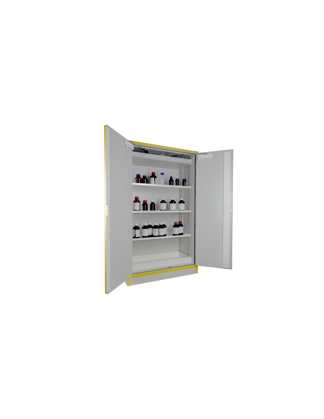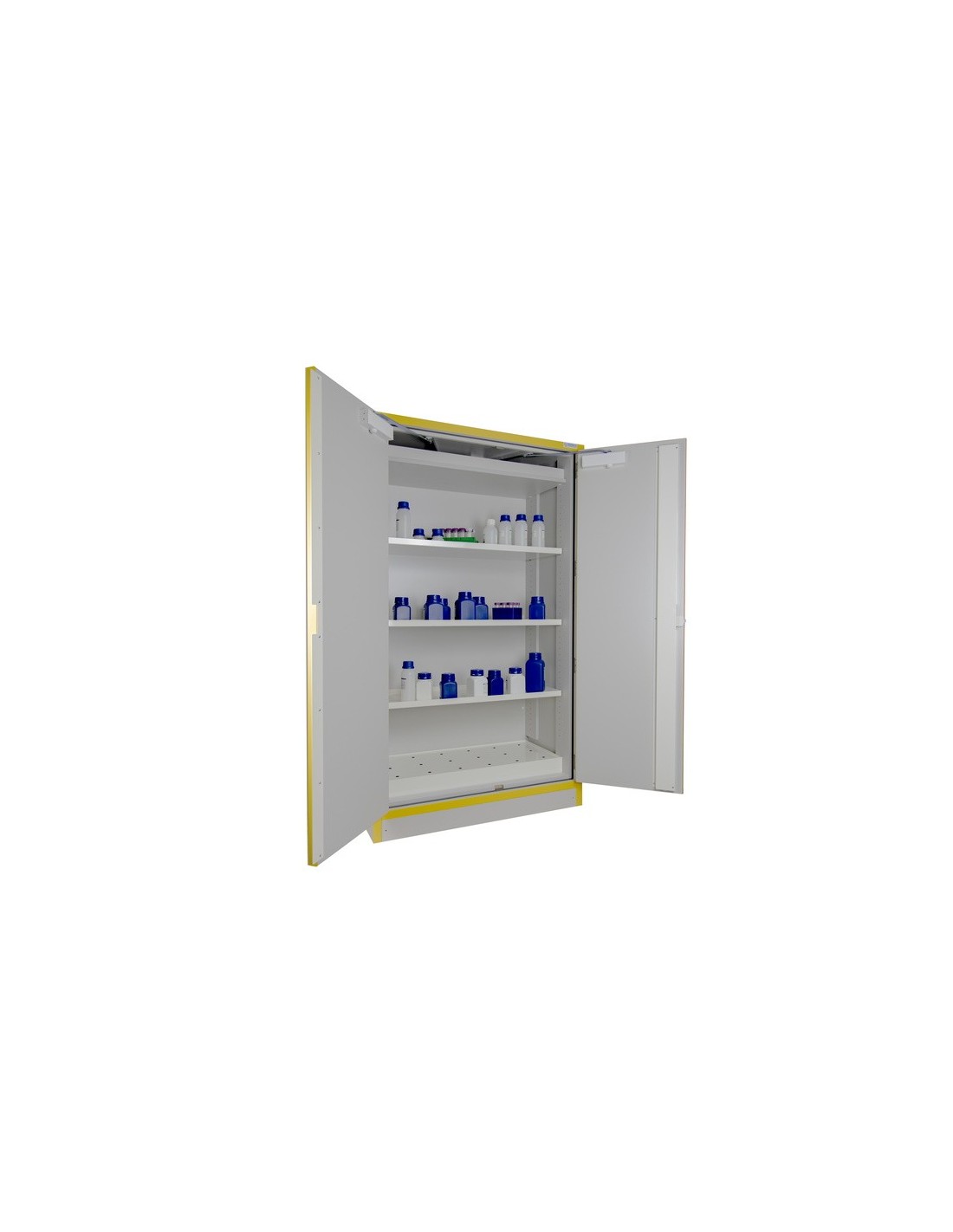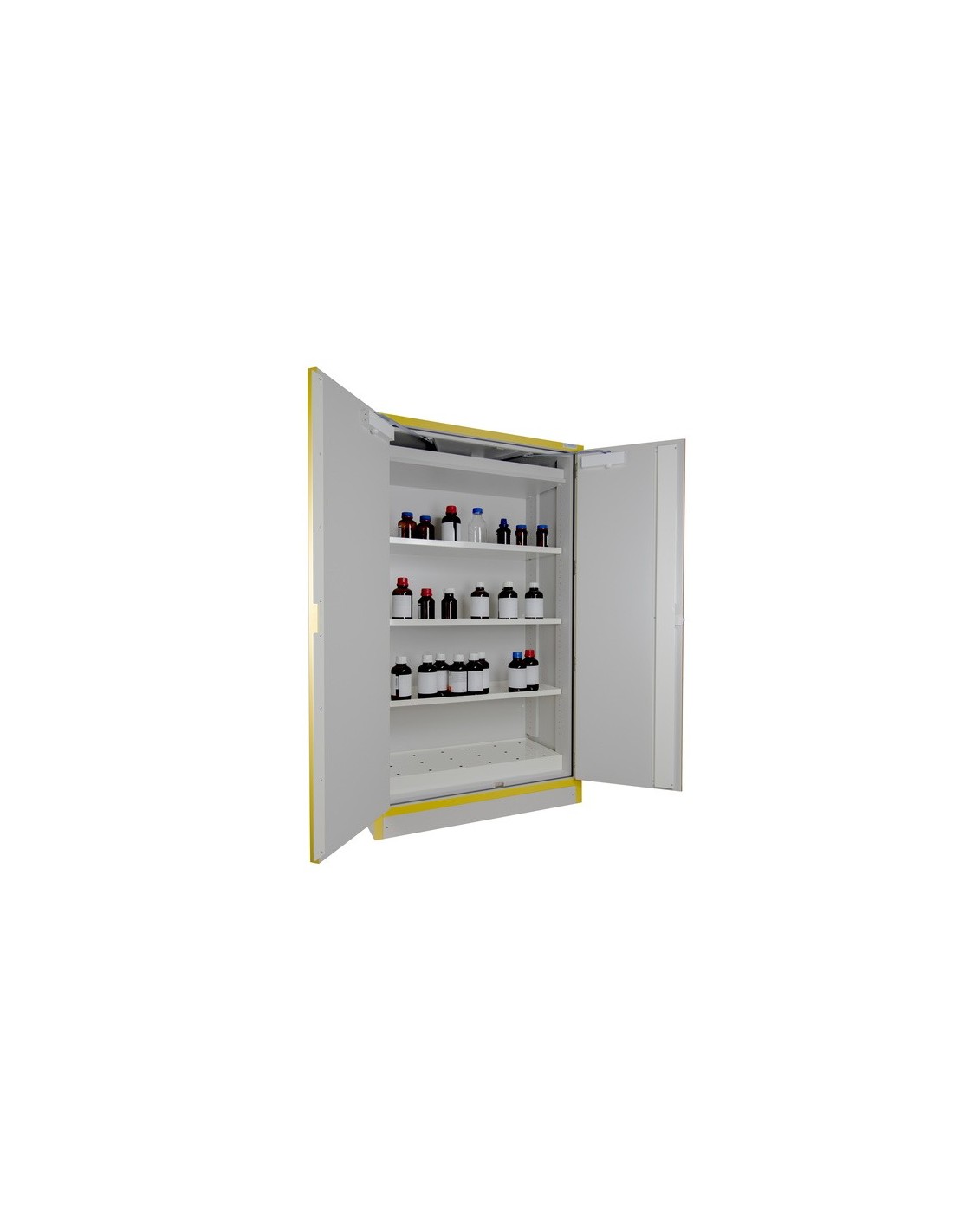 Référence 3035E Conformité EN 14470-1, FM 6050 Construction de l'armoire bois mélaminé Couleur des portes gris clair RAL 7035 Nombre de porte(s) 2 Type de porte(s) battantes Charnières droite et gauche Fermeture de(s) porte(s) automatique Diamètre de ventilation (mm) 100 Nombre de compartiment(s) 1 Etagère(s) 3 Sur-étagère(s) en PVC Option Bac(s) de rétention 1 Bac(s) de rétention en PVC Option Caillebotis Option Capacité de rétention (L) 41 Dimensions extérieures H x L x P (mm) 1980 x 1115 x 550 Dimensions intérieures H x L x P (mm) 1581 x 1001 x 419 Dimensions à l'expédition H x L x P (mm) 2200 x 1200 x 800 Charge admissible 50 Capacité de stockage (L) 250 Poids (kg) 210.00 Code douanier 94036000