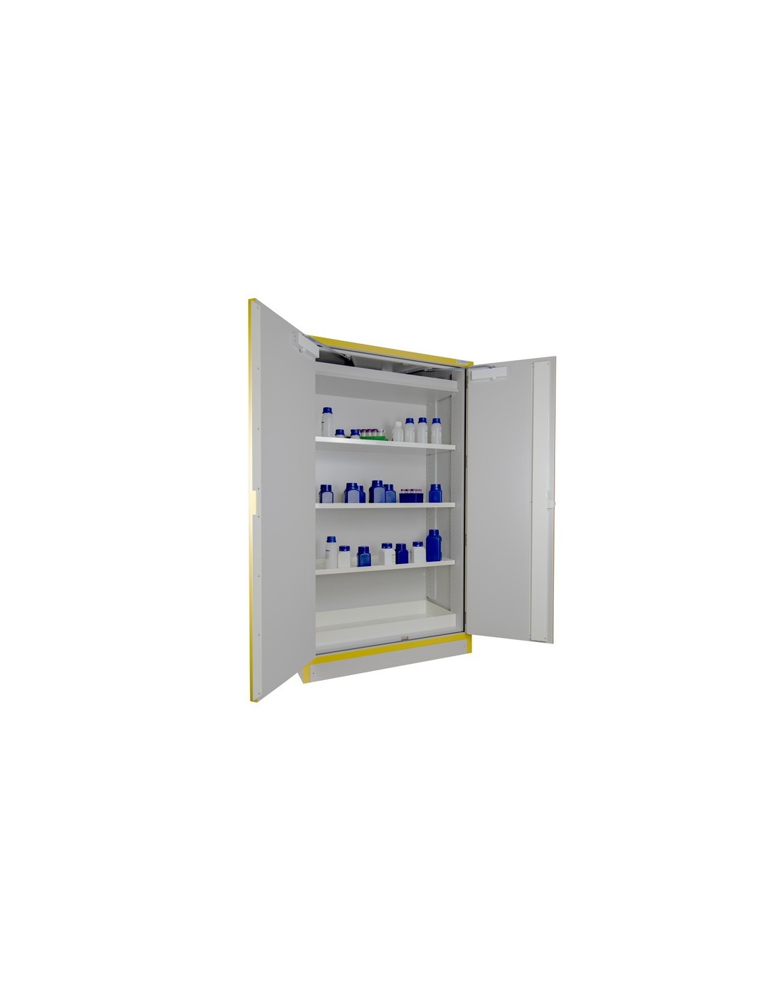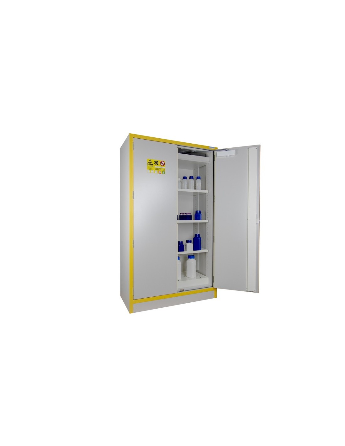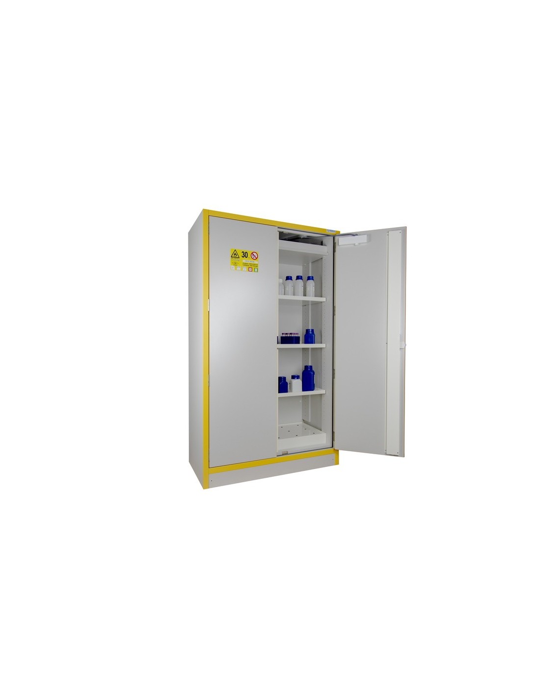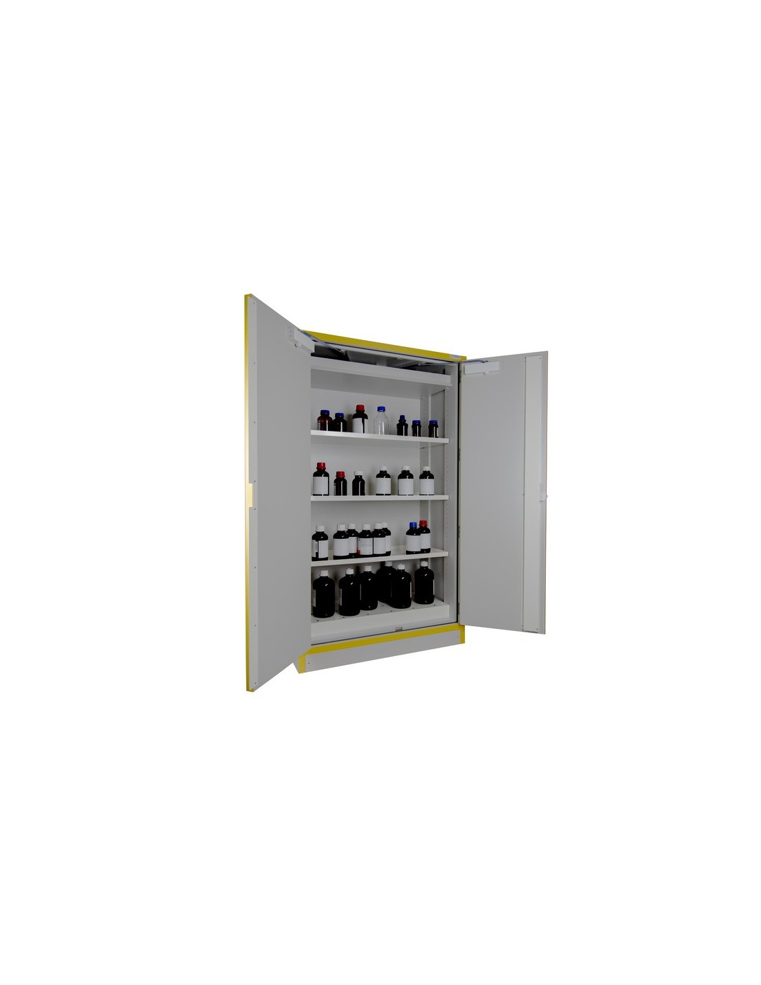 Référence 3035E Conformité EN 14470-1, FM 6050 Construction de l'armoire bois mélaminé Couleur des portes gris clair RAL 7035 Nombre de porte(s) 2 Type de porte(s) battantes Charnières droite et gauche Fermeture de(s) porte(s) automatique Diamètre de ventilation (mm) 100 Nombre de compartiment(s) 1 Etagère(s) 3 Sur-étagère(s) en PVC Option Bac(s) de rétention 1 Bac(s) de rétention en PVC Option Caillebotis Option Capacité de rétention (L) 41 Dimensions extérieures H x L x P (mm) 1980 x 1115 x 550 Dimensions intérieures H x L x P (mm) 1581 x 1001 x 419 Dimensions à l'expédition H x L x P (mm) 2200 x 1200 x 800 Charge admissible 50 Capacité de stockage (L) 250 Poids (kg) 210.00 Code douanier 94036000