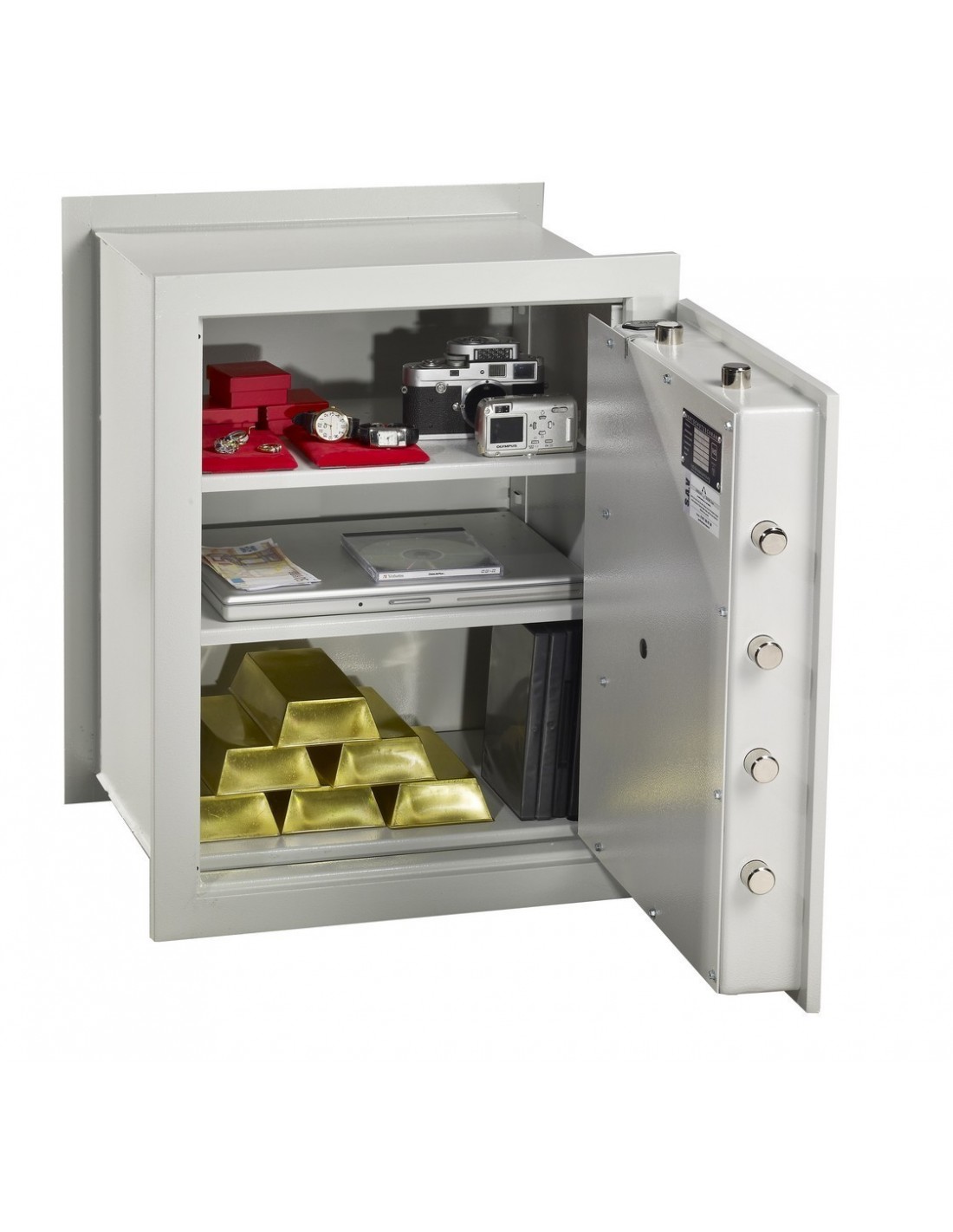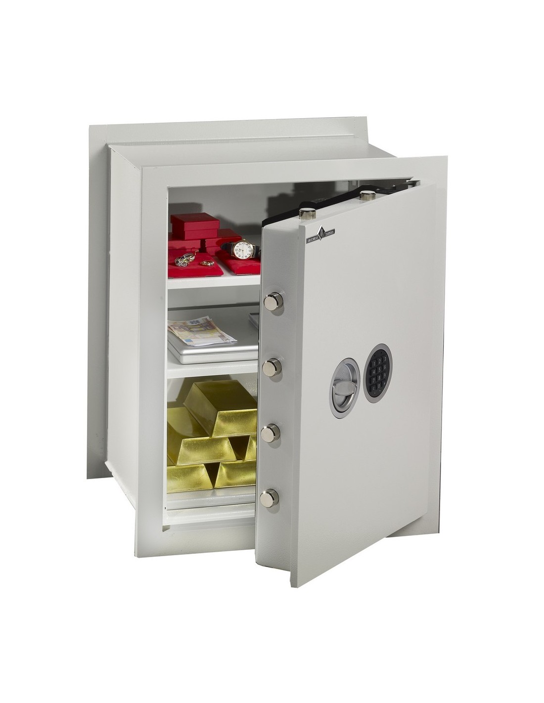 Ce modèle est fait spécialement pour s’intégrer dans votre mur et l’abriter des regards malintentionnés, offrant de sécuriser des biens de valeur à hauteur de 25 000€. Vous pouvez ainsi y engranger vos liquidités, vos bijoux de valeur aussi bien que des électroniques de valeur. Sa porte est renforcée par un pavé de manganèse anti-perçage, affleurant avec poignée encastrée pour une meilleure discrétion.