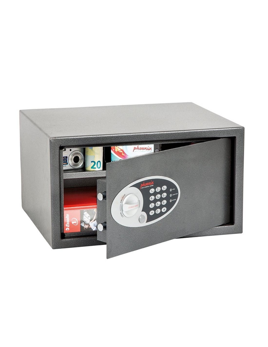 Le Coffre Fort De Sécurité Phoenix Vela SS0803E de Phoenix de construction robuste est idéal pour usage professionnel, ou domestique, il peut être aussi utilisé dans des chambres d’hotel. Il offre une protection de valeur assurable de 1,000€ d’argent liquide et de 10,000€ d’objets de valeurs. Le Coffre Fort De Sécurité Phoenix Vela SS0803E de Phoenix fournit une protection très satisfaisante contre les cambrioleurs, il est équipé de verrouillage électronique «convivial» avec solénoïde anti-sabotage ou rebond de haute qualité, avec fonction de neutralisation des clés (2 clés fournies).
