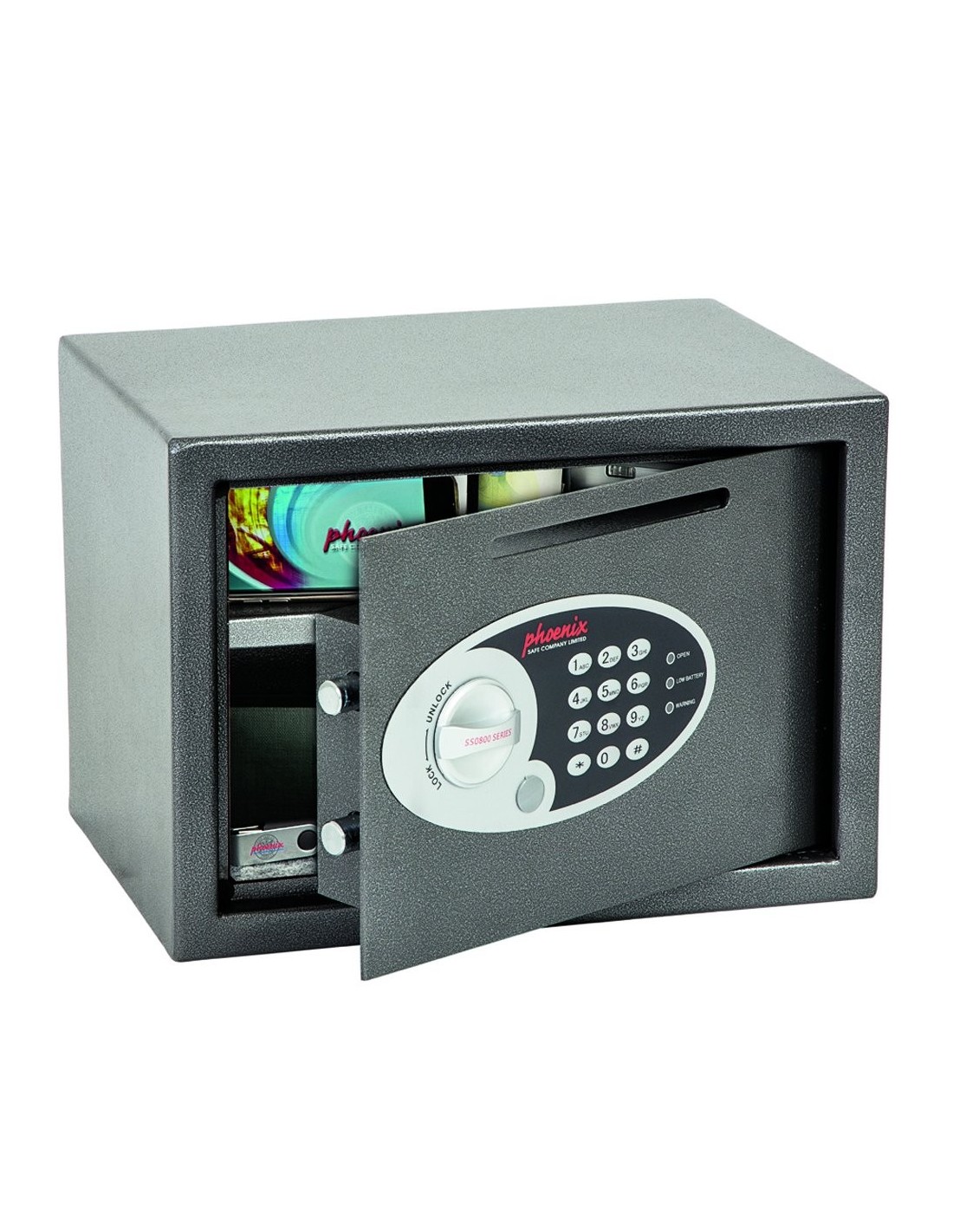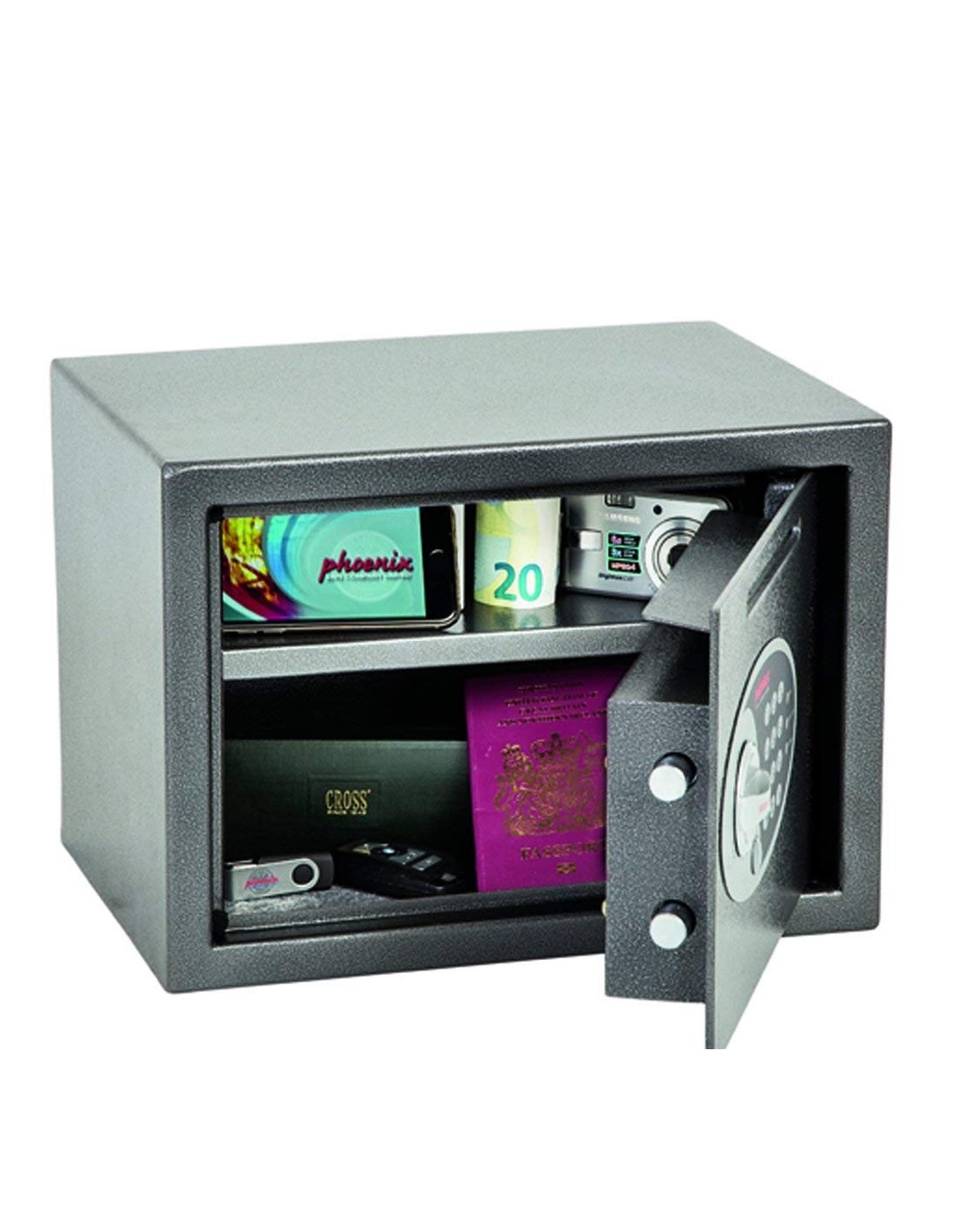 Le Coffre Fort De Sécurité Vela SS0802ed de Phoenix de construction robuste est idéal pour usage professionnel, ou domestique, il peut être aussi utilisé dans des chambres d’hotel. Il offre une protection de valeur assurable de 1,000€ d’argent liquide et de 10,000€ d’objets de valeurs. Le Coffre Fort De Sécurité Vela SS0802ed de Phoenix fournit une protection très satisfaisante contre les cambrioleurs, il est équipé de verrouillage électronique «convivial» avec solénoïde anti-sabotage ou rebond de haute qualité, avec fonction de neutralisation des clés (2 clés fournies).