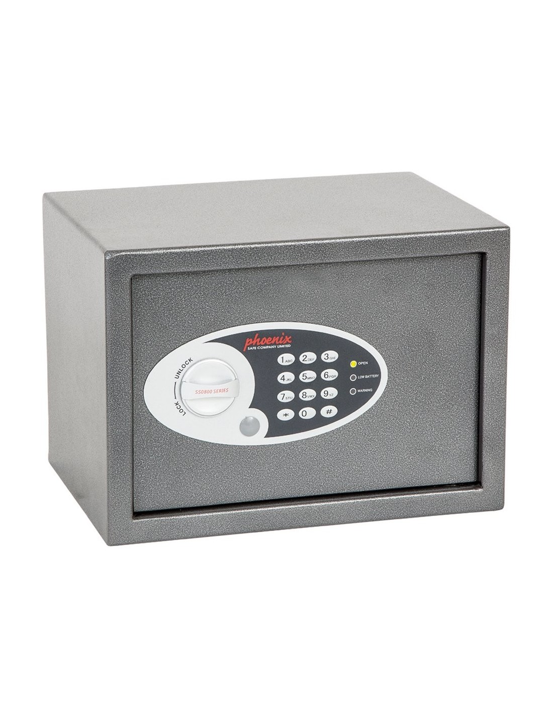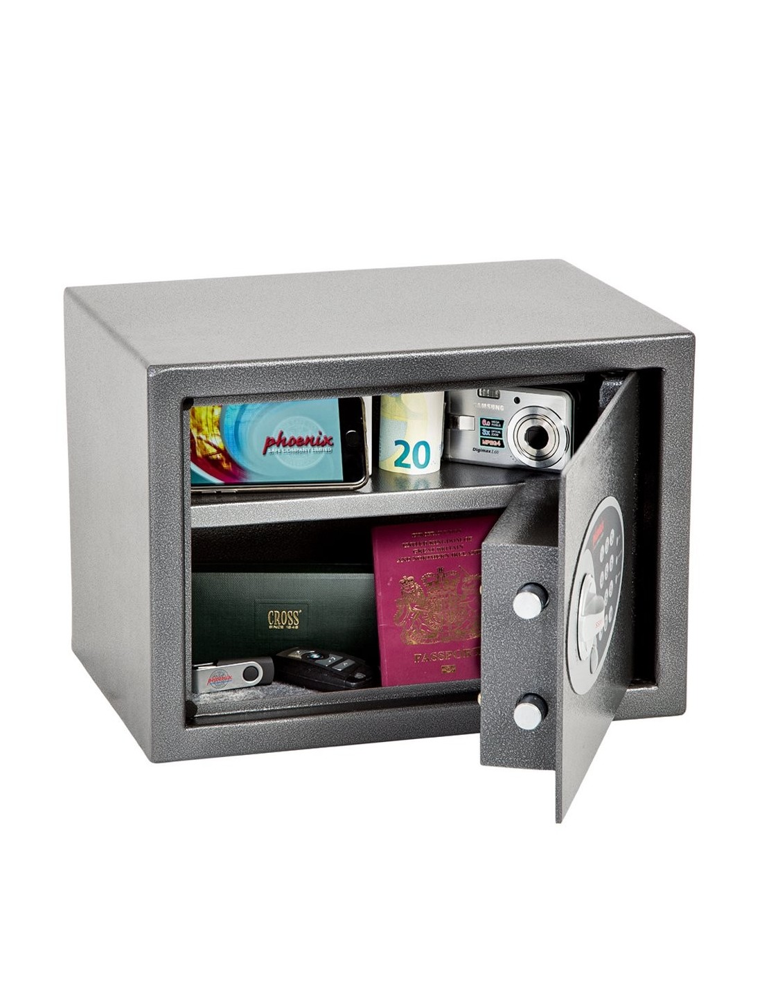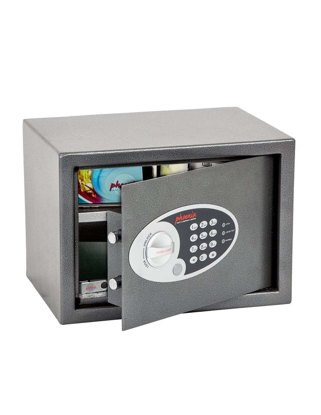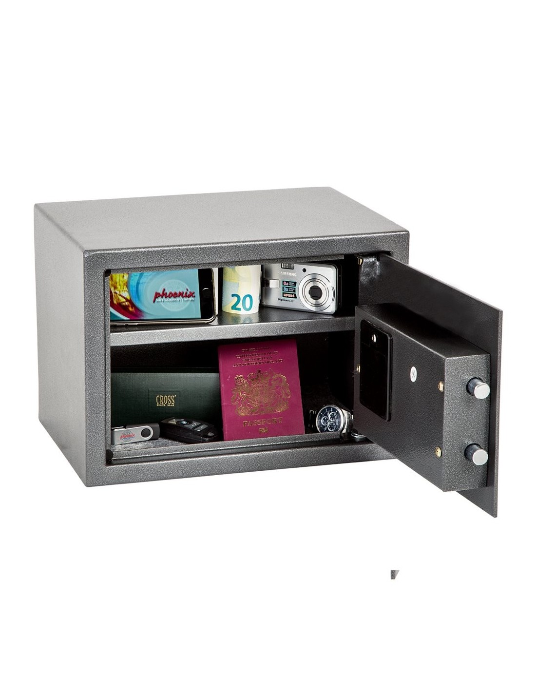 Le Coffre fort Dione à Serrure électronique SS0301E de Phoenix de construction robuste est idéal pour usage professionnel, ou domestique, il peut être aussi utilisé dans des chambres d'hôtel. Il offre une protection de valeur assurable de 1,000€ d’argent liquide et de 10,000€ d’objets de valeurs.