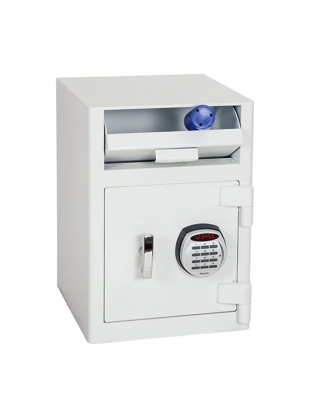 La Caisse de dépôt SS0996ED de la marque Phoenix est construit en acier d’épaisseur de 6 mm, la porte du coffre est en tôle d’acier d’épaisseur de 12 mm et verrouillée d'une d’une serrure électronique de haute sécurité R3 facile d’utilisation avec un écran LED clair. Afin de renforcer la sécurité, la serrure peut être programmée avec un double contrôle, code caché et code brouillé. Au dessus il y a la fente de dépôt avec plaque de déflecteur inclinable pour garantir que le contenu ne peut pas être «pêché», la caisse de dépôt dispose aussi d’une plaque de verrouillage de nuit pour une sécurité accrue en dehors des horaires de travail.