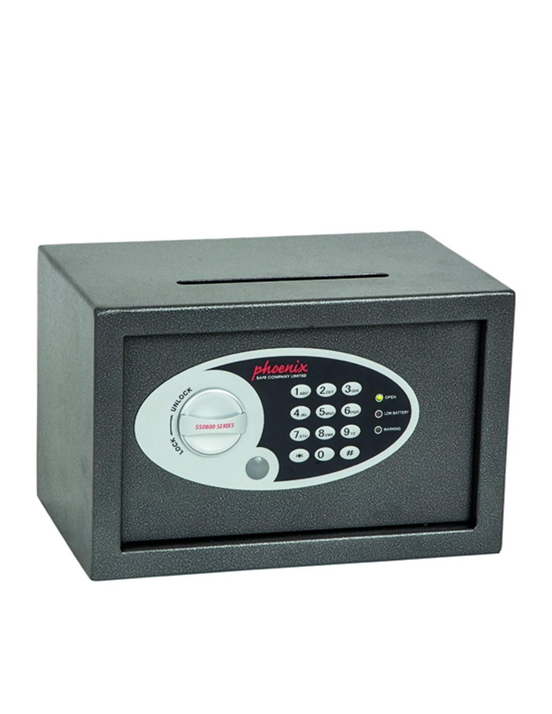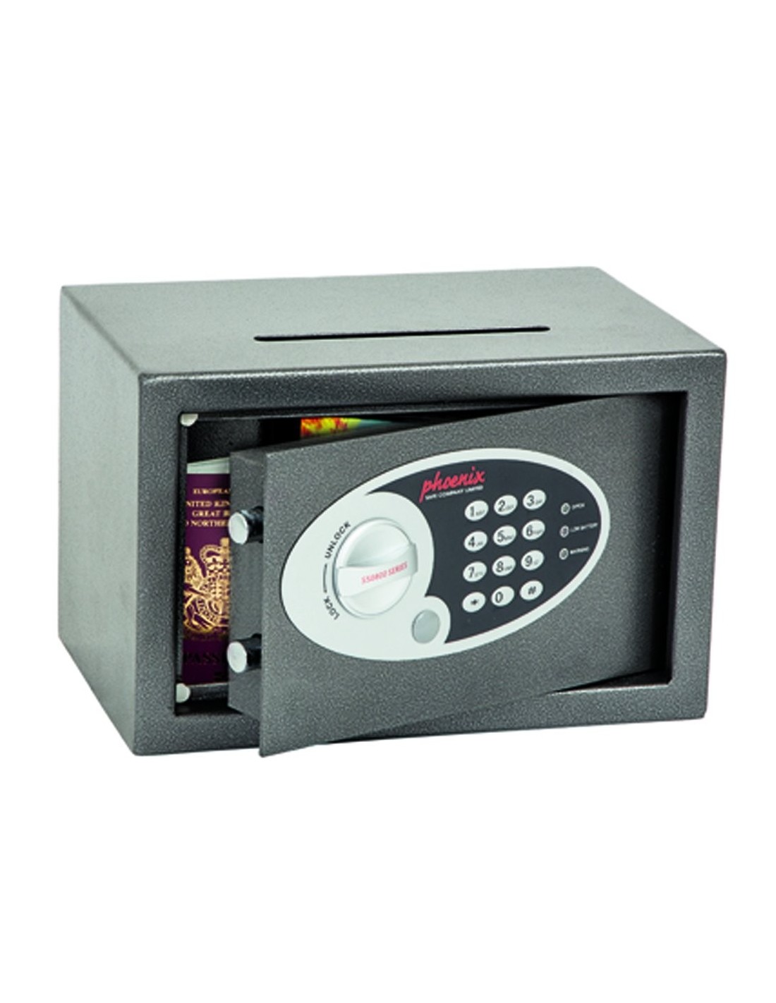 Trouvez dans ce modèle aussi une fente de dépôt de 150 X 12 mm, pour faciliter l’insertion de vos argents sans avoir à ouvrir la porte du coffre fort.