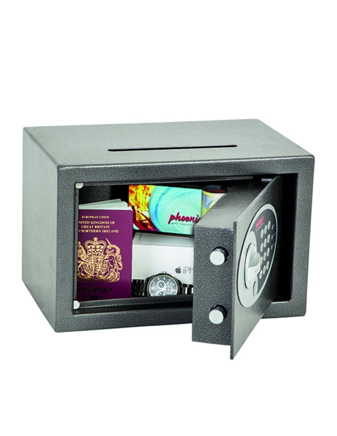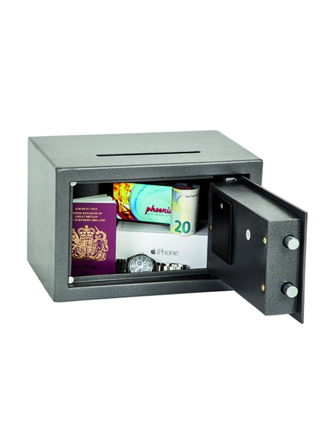 Trouverez Le Coffre Fort De Sécurité Phoenix Vela Ss0801ed de Phoenix équipé de d'une lumière intérieure à LED qui permet de voir facilement le contenu, même dans les endroits très faiblement éclairées, avec des boulons adaptés pour murs en briques ou sol en béton pour une fixation au sol ou au mur.