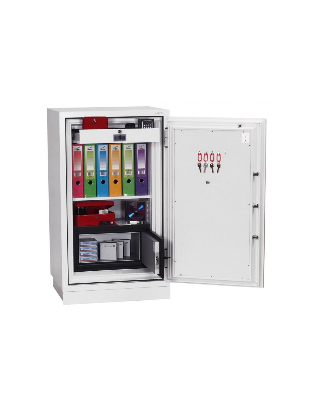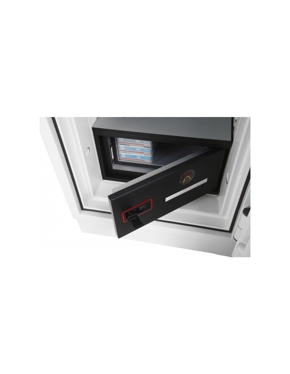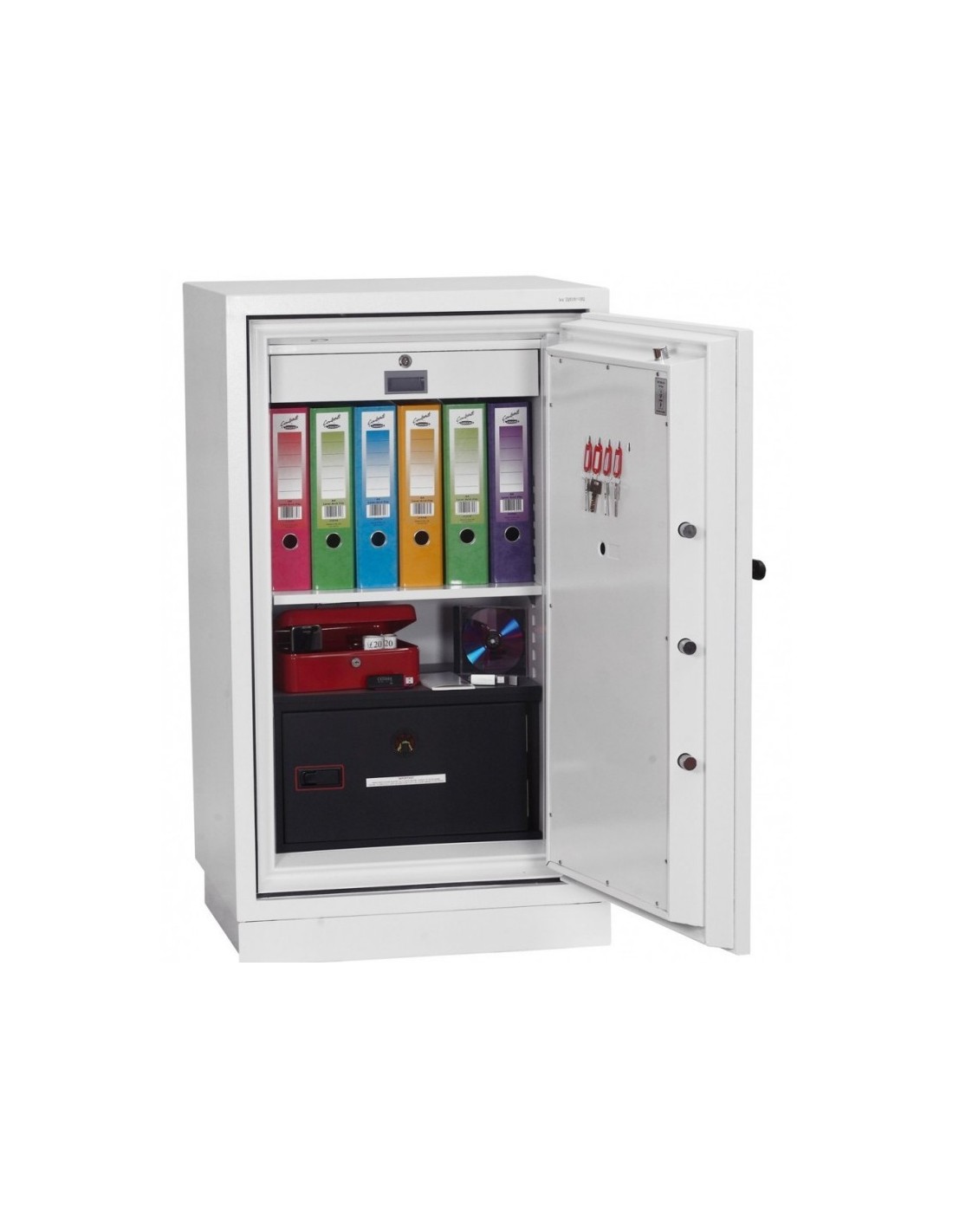 Ce coffre fort présente en fait, 4 coffres forts en 1, grâce à ses caractéristiques techniques qui assemblent les meilleurs critères de sécurité. Ce coffre fournit une protection contre le feu pour les documents papier, les sauvegardes informatiques, média Digital (DVD, données de mémoire) et de sécurité pour l’argent liquide et les objets précieux.