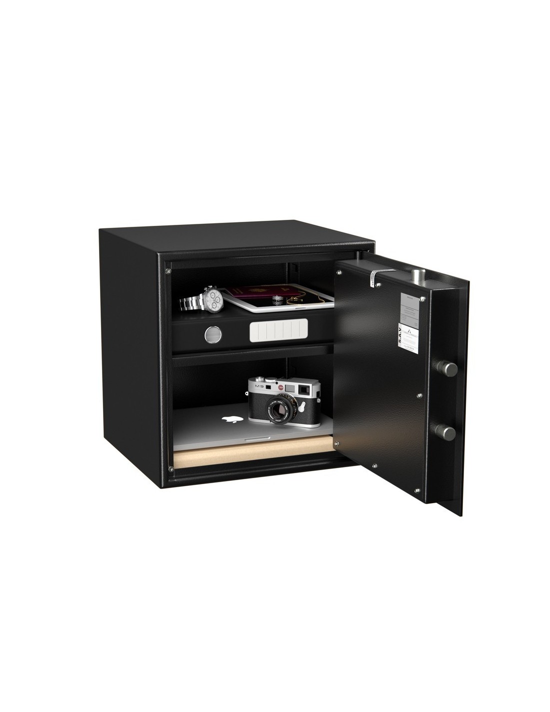 Ce coffre HT50 répond aux normes européenne anti-effraction EN 14450 classé S1, construit en acier 1er choix, structure indéformable et monobloc en acier de 30/10e. Sa porte est inarrachable sans gonds apparents, à double paroi épaisseur totale 40 mm dont 60/10e en acier