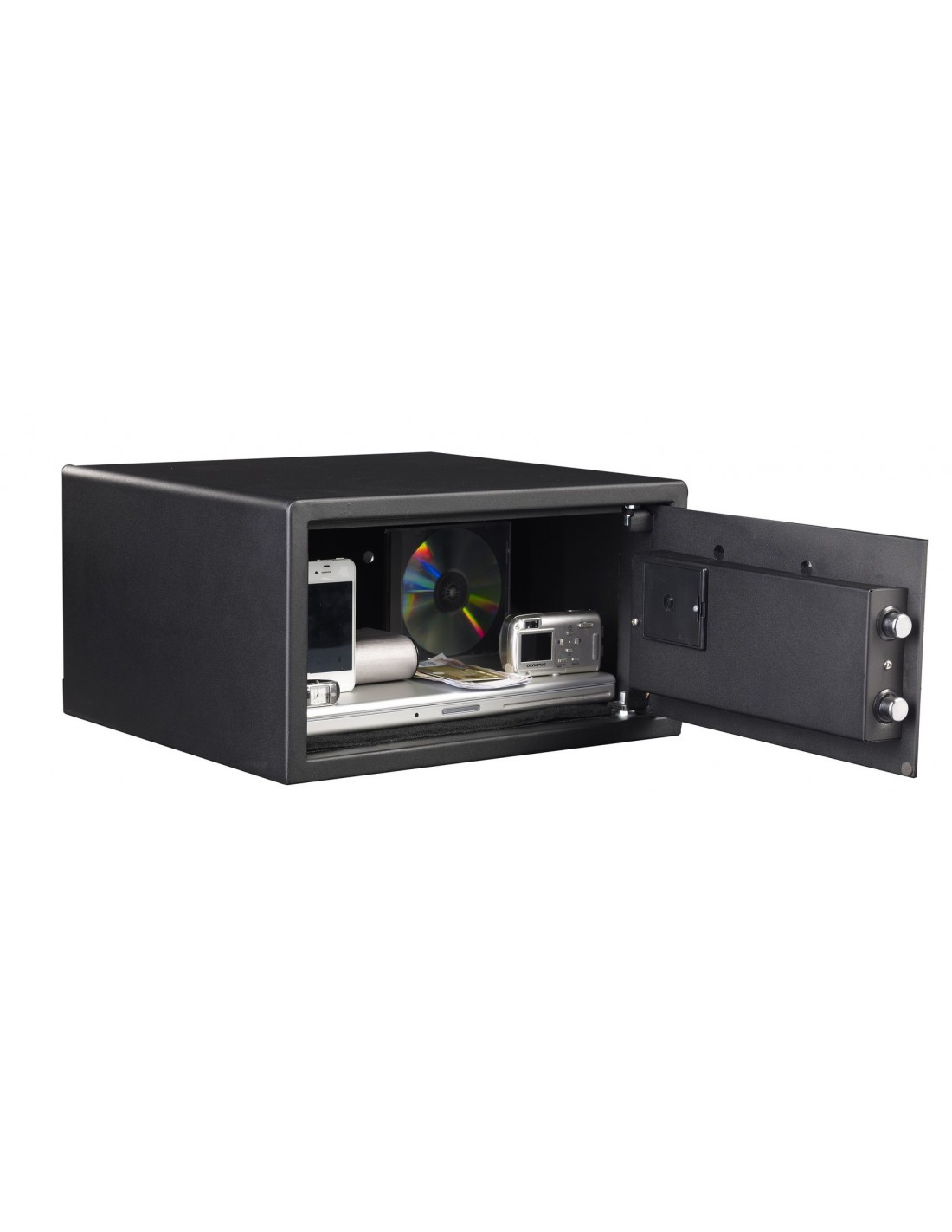 ce petit coffre fort hotel de volume de 42 L est construit entièrement en acier, sa porte est blindée de 50 mm avec blindage de façade en 6 mm.ce coffre fort élégant est de couleur noir, et habillé au fond de moquette.
