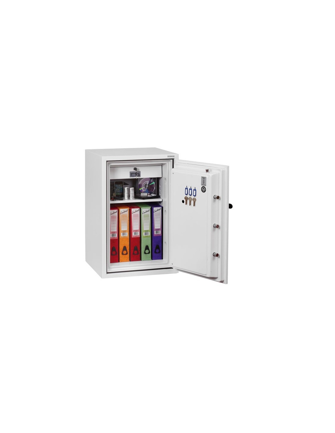 Le Coffre fort ignifuge Fire Fighter FS0442E de Phoenix fournit 90 minutes de protection contre le feu pour les documents papier et jusqu’à une heure de protection pour les DVD, disques durs et clefs USB. Pour plus d’assurance et de sérénité, elle a été testée pour une chute de 9,1 mètres avec résistance à l'impact pour une chute à travers les étages en feu d'un bâtiment ou l'effondrement de l'immeuble