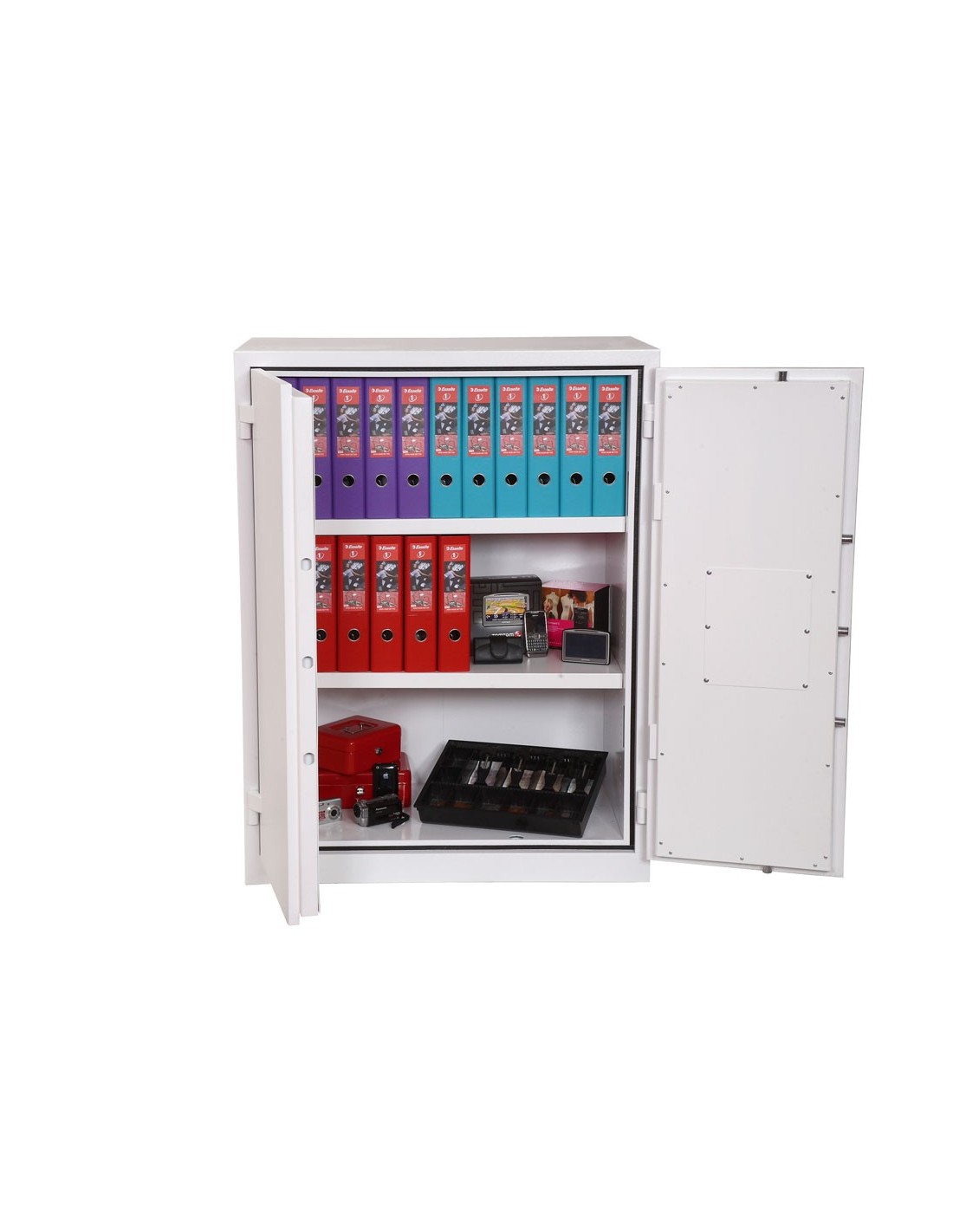 Cette armoire forte antivol et anti-feu est fournie avec 2 étagères réglables en hauteur qui incluent également des rails de suspension pour les dossiers latéraux en standard.