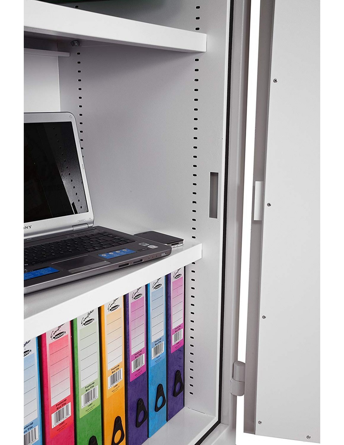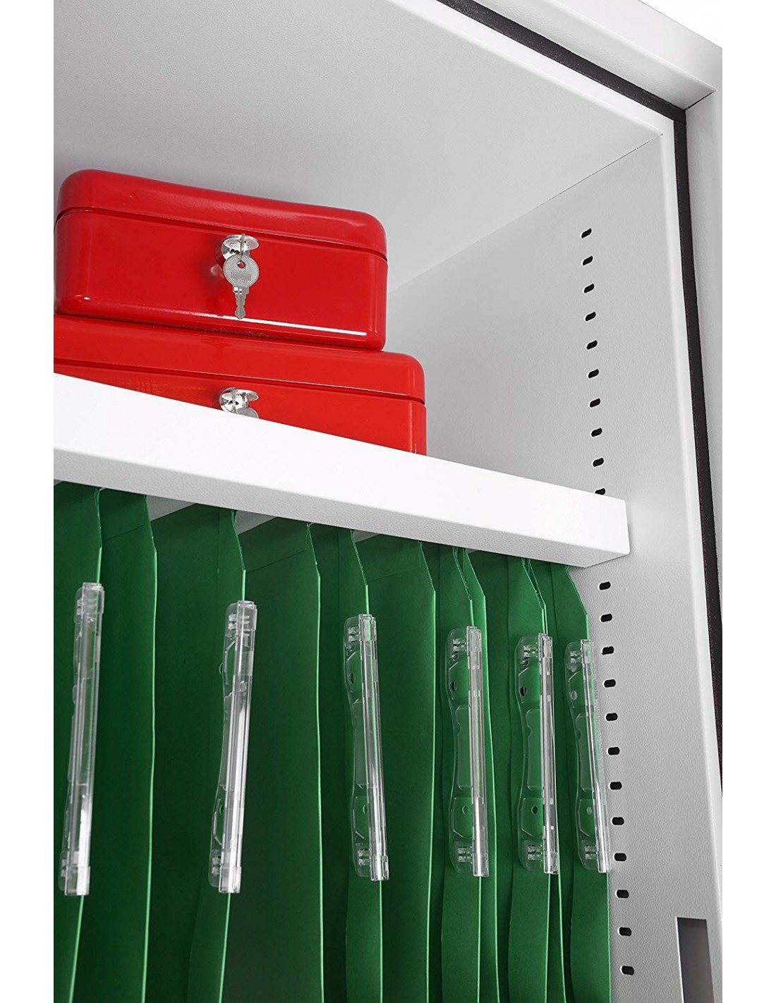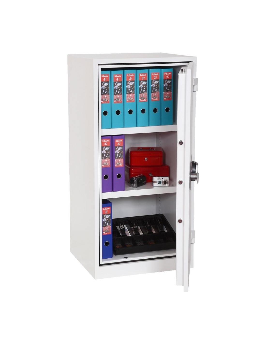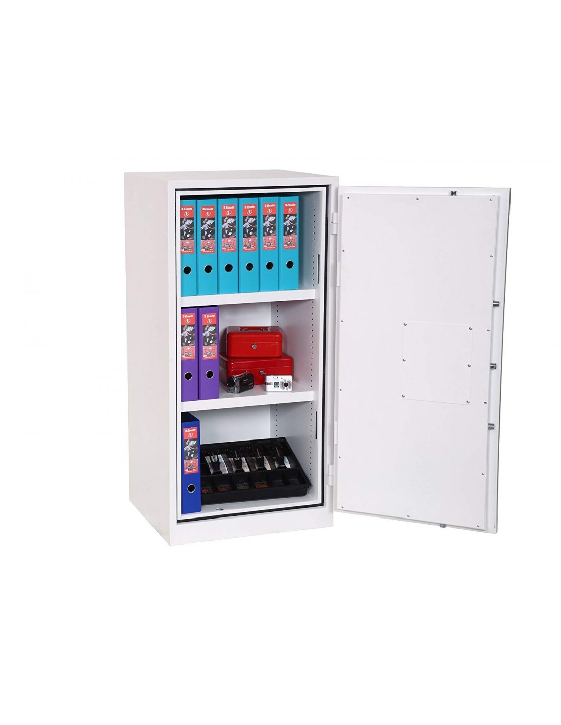 Cette armoire forte antivol et anti-feu est fournie avec 2 étagères réglables en hauteur qui incluent également des rails de suspension pour les dossiers latéraux en standard.