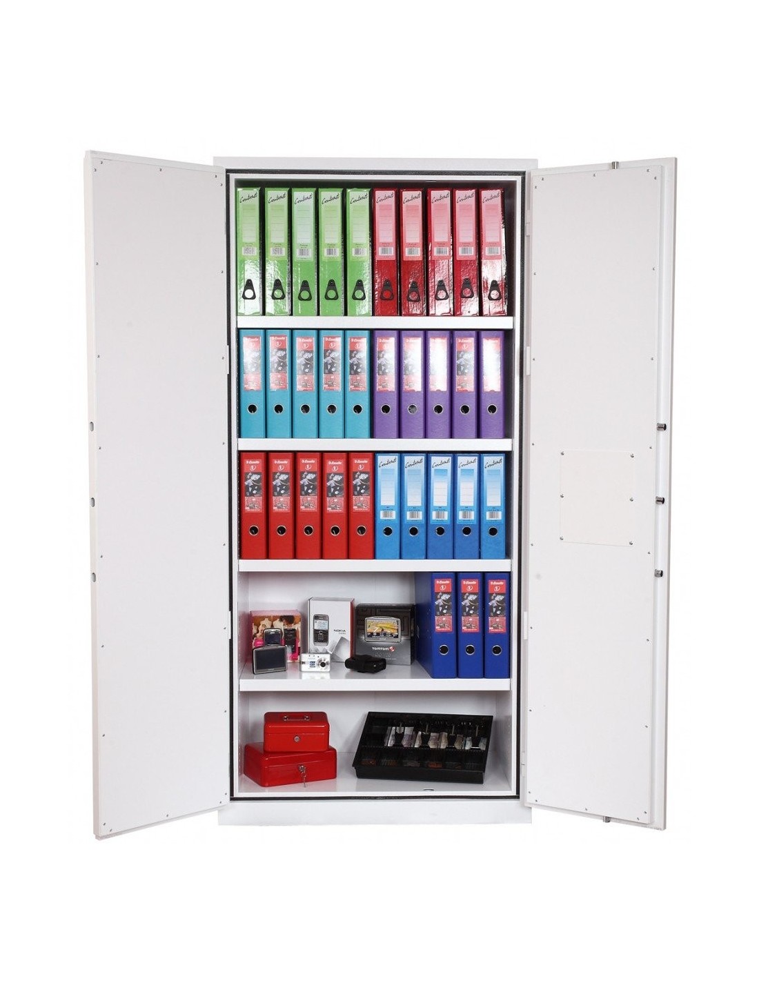 Cette armoire forte antivol et anti-feu est fournie avec 2 étagères réglables en hauteur qui incluent également des rails de suspension pour les dossiers latéraux en standard
