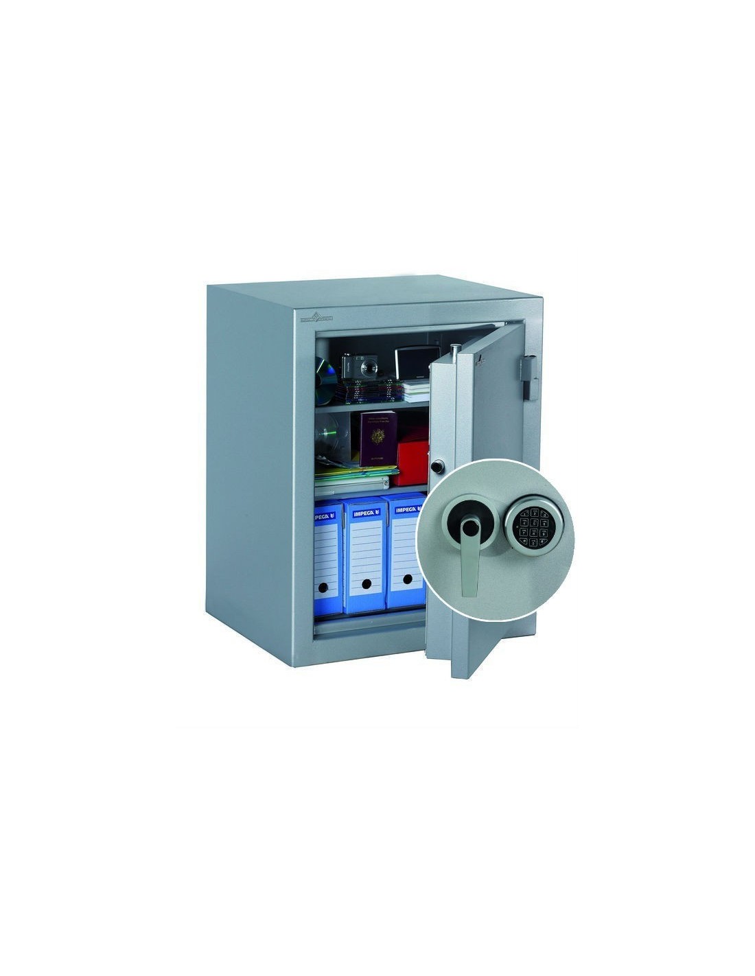 La porte est renforcée de 15 mm et verrouillée par pênes tournants chromés, et sécurisée par une serrure électronique réf. Z03, et pour une meilleure assurance de vos objets, le coffre fort ignifuge Zéphir 2138 classe 2 est équipé de condamnation définitive du coffre par délateur mécanique.