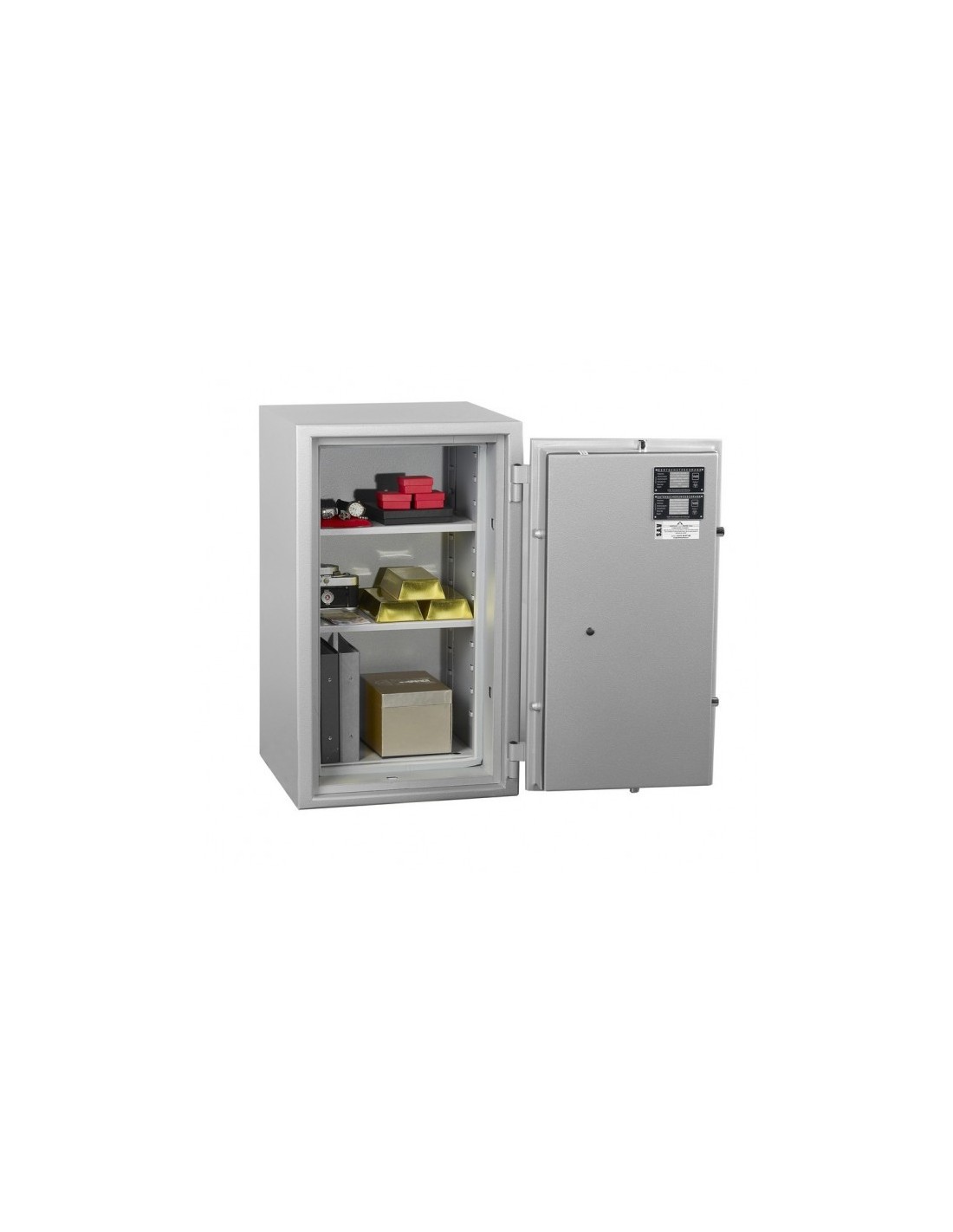 La porte est verrouillée sur les 4 cotés et menée d’une serrure à clé combinée d’une serrure électronique.
