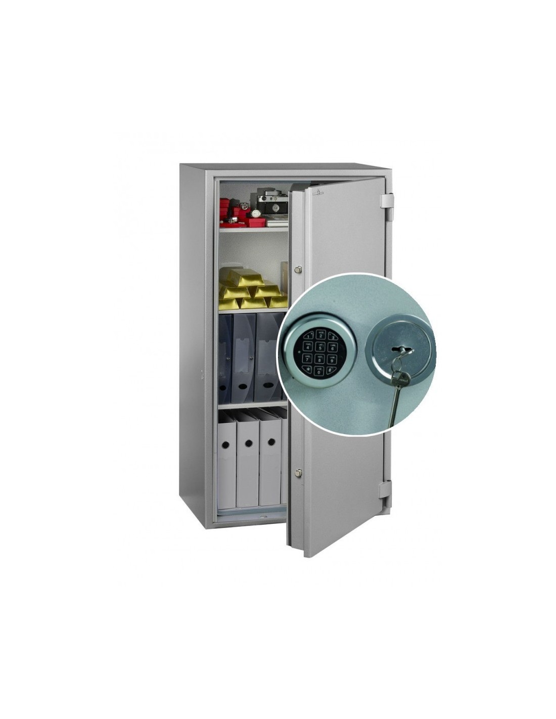 La porte est verrouillée sur les 4 cotés et menée d’une serrure à clé combinée d’une serrure électronique.