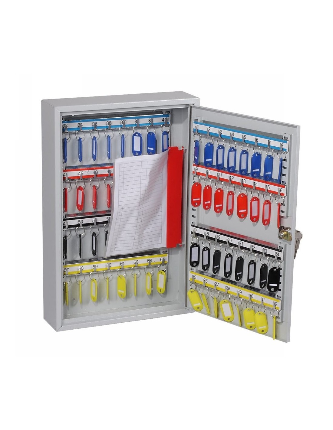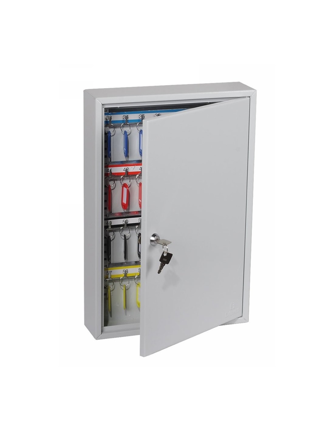 Il s’agit d’une armoire qui vous permet d’avoir le contrôle entre vos mains, idéales pour le commerce de l'automobile ou les agences immobilières. La boite à clés serrure à clé KC0602K est de construction robuste apte pour un rangement optimisé de grands nombre des clés, livrée avec des barres pour crochets réglables et des étiquettes numérotées, aussi avec des trous pré-percé pour une fixation au mur.