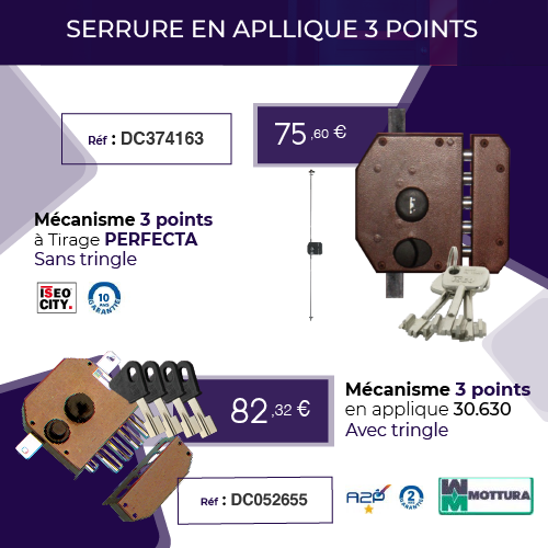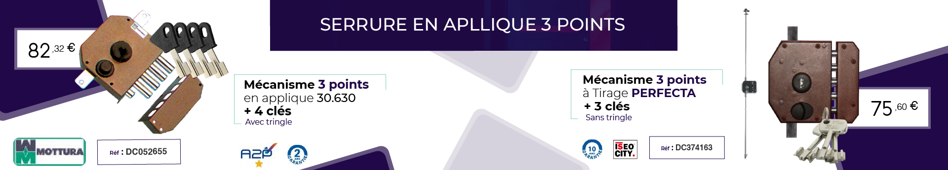 - Serrure 3 points en acier simple pompe extérieure.- Fournie avec 3 clés .- Cylindre avec protège pompe tournant de longueur 50 mm de 30 mm de diamètre.- Jeux de tringle en option sous la référence DC93140V000 .