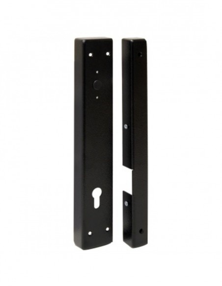 - Carter électro-verrou et support gâche en acier laqué noir.