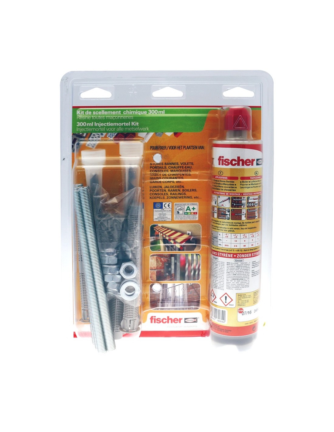 - 1 cartouche FIS PLUS 300 T, 2 embouts, 6 tiges filetées M10x160, 6 écrous, 6 rondelles, 6 tamis 16x130