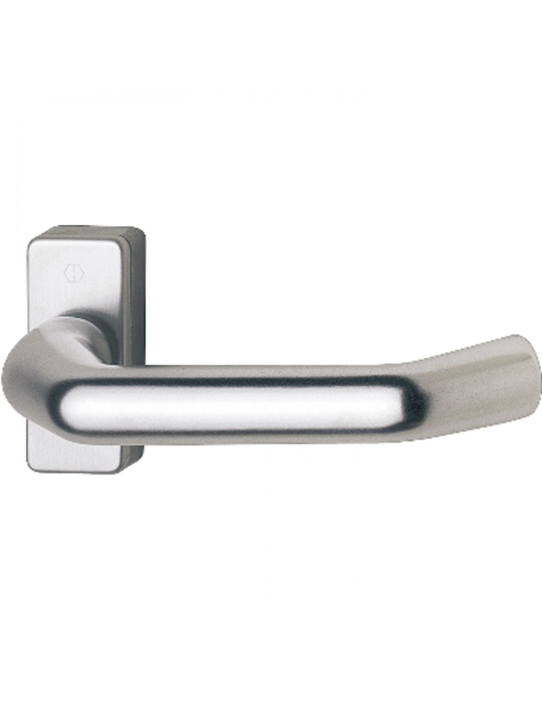 - Béquille double déportée en aluminium anodisé ou époxy sur rosaces ovales pour menuiserie métallique.