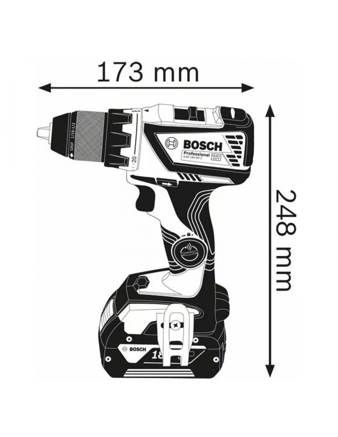 une perceuse-visseuse sans fil GSR 18V-60 C Professional dotée d'une performance idéal grâce au couple de 60 Nm et à la tête de 174 mm de long. La GSR 18V-60 C Professional dispose également d’un engrenage 2 vitesses, d’un mandrin Autolock, d’un clip de ceinture/crochet, de l’Electronic Motor Protection, d’une batterie Lithium-Ion et d’un mandrin tout en métal.