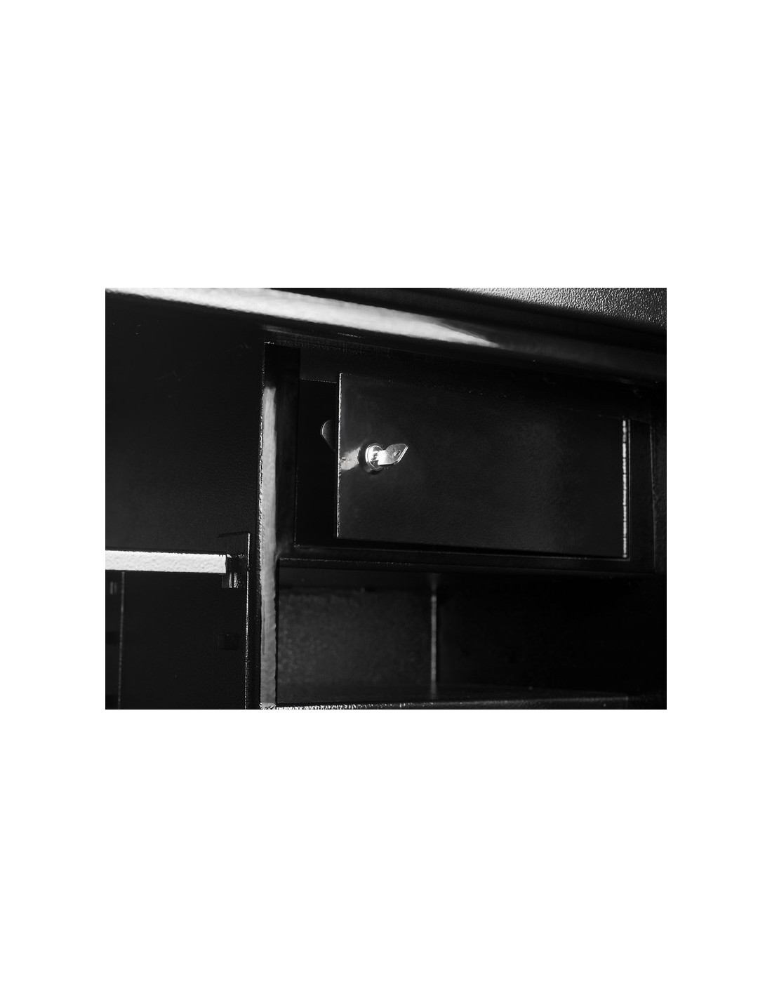 Encore plus pratique, vous trouverez dedans une paroi verticale de séparation avec 2 râteliers amovibles pour 14 armes longues avec lunettes et 1 coffre intérieur non-démontable avec serrure à clé.