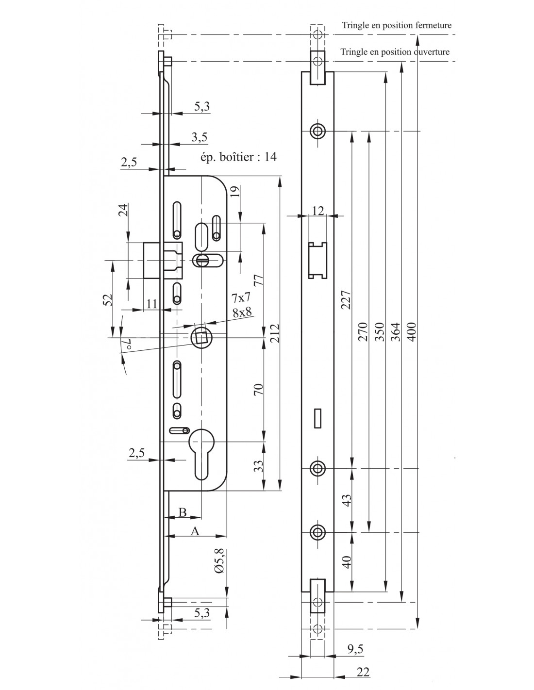 -A : Crémone inox têtière de 22 mm pour menuiserie aluminium. Carré de 7 , carré de 8 sur demande