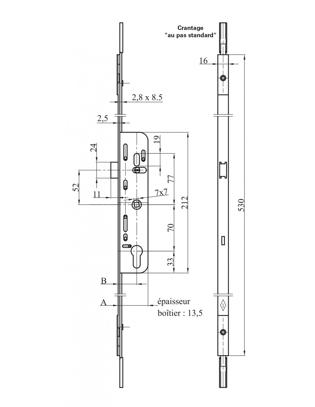 - B : Crémone têtière acier de 16 mm (longueur 530 mm) pour menuiserie bois, ajustable haut et bas par prolongateurs (crantage standard)