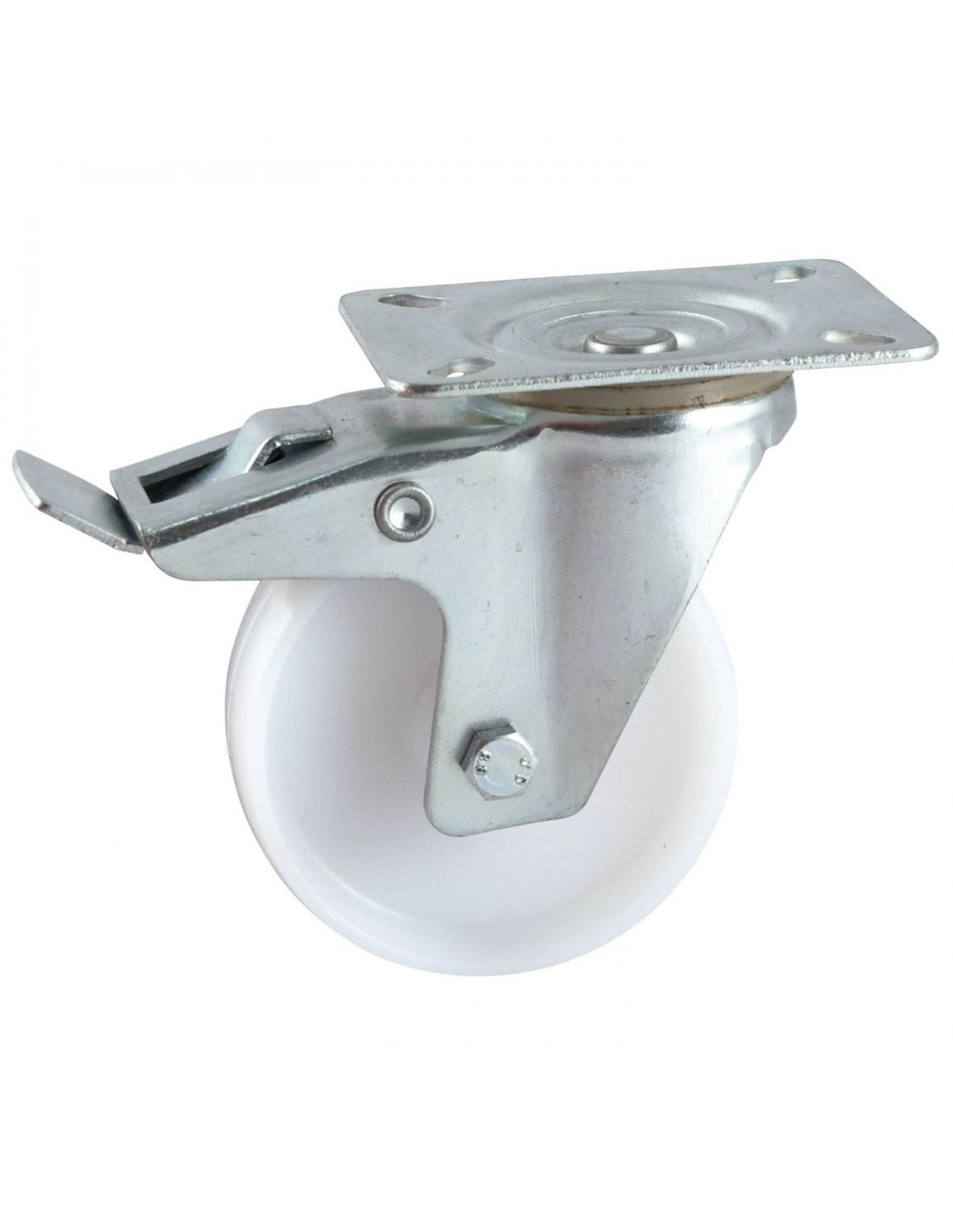 - Roulette polyamide blanc. - Platine rectangulaire en tôle d'acier emboutie finition zinguée. - Pivotement sur double couronne de billes trempées avec joint de protection. - Blocage double effet pivotement et roue.
