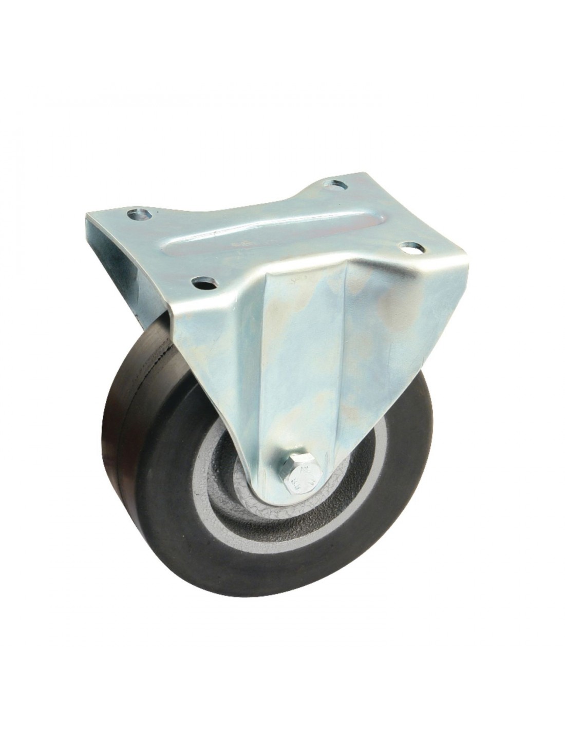 - Roue à bandage caoutchouc et corps en fonte équipée de roulements à billes de précision. - Platine tôle acier emboutie lourde. - Couronne de protection du pivot.