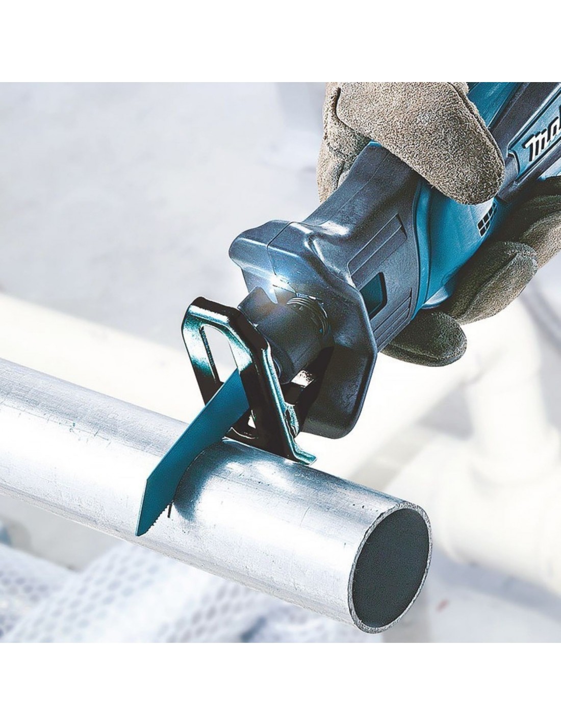 La scie récipro 18 V Li-Ion DJR183Z offre une très grande ergonomie grâce à l'utilisation du levier d'interrupteur ou de la gâchette, en fonction du travail à effectuer. Elle permet de changer de lame sans outil et le sabot est réglable facilement. De plus, le frein électrique coupe le moteur et arrête la lame instantanément. La scie dispose d'un éclairage LED pour une bonne visibilité de la base de travail.