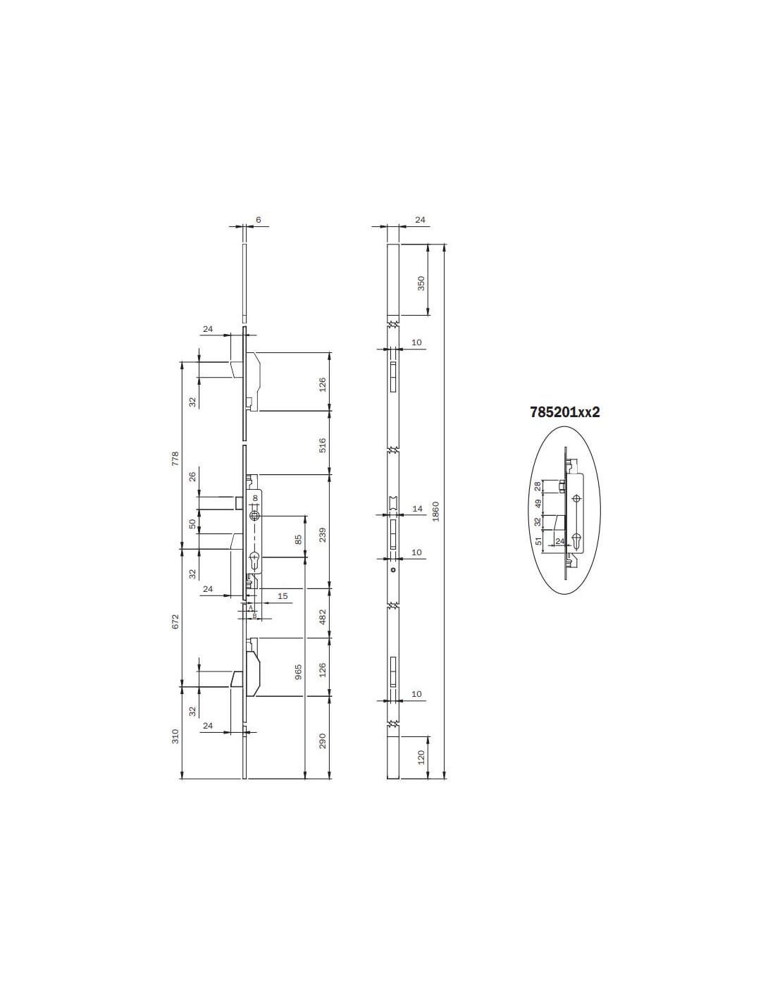 - Serrure Multipoints à encastrer pour des montants à 3 fermetures latérales.