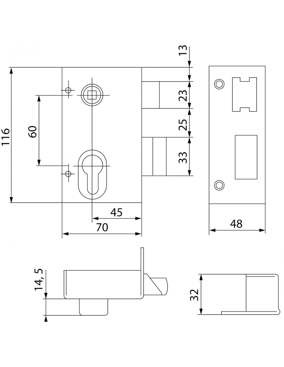 - Dimensions de la serrure verticale 116 x 70 mm.