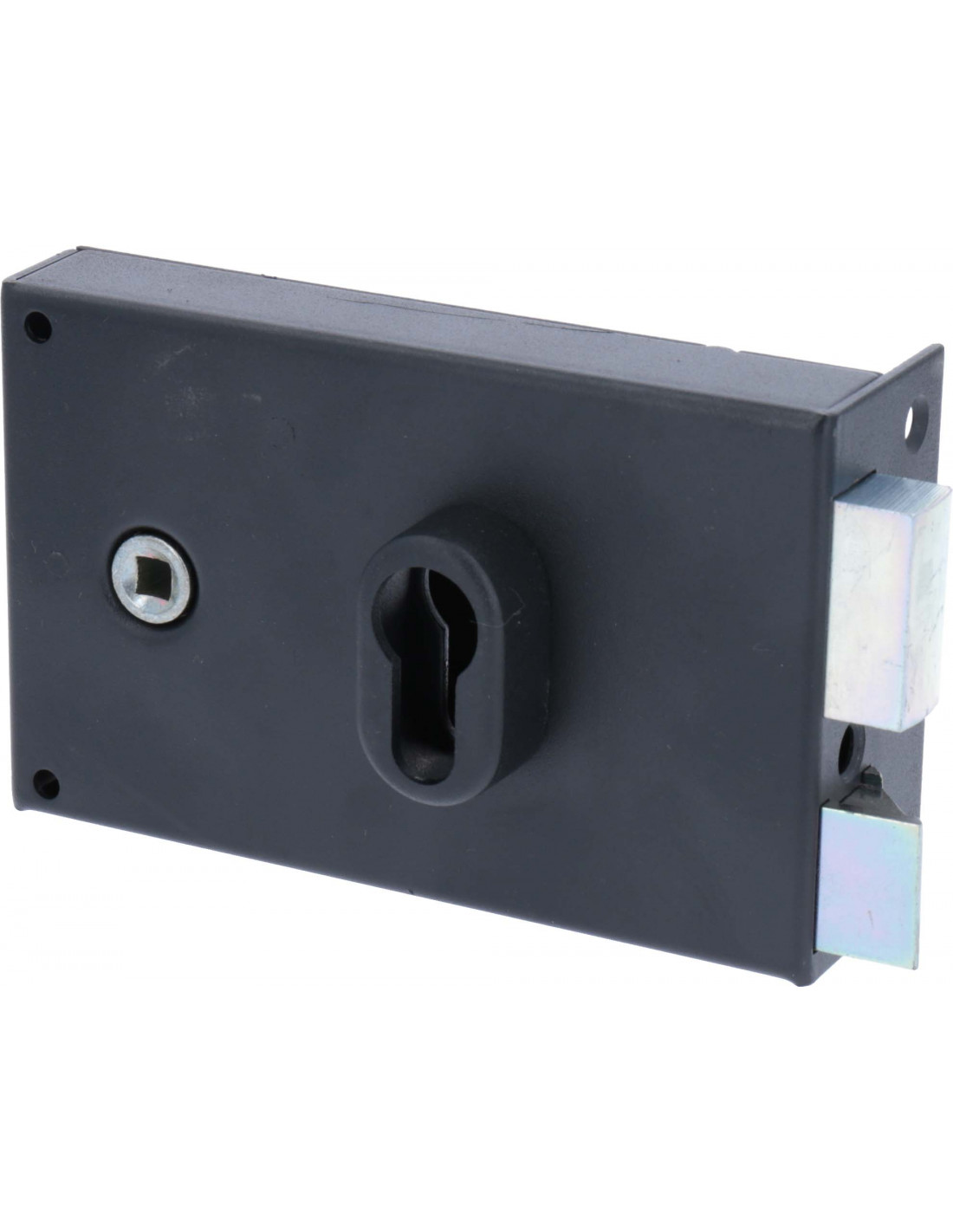 - Serrure 1 point en applique de grille pour profil européen, à bords rectangulaires, coffre et gâche en acier cambré époxy noire.
