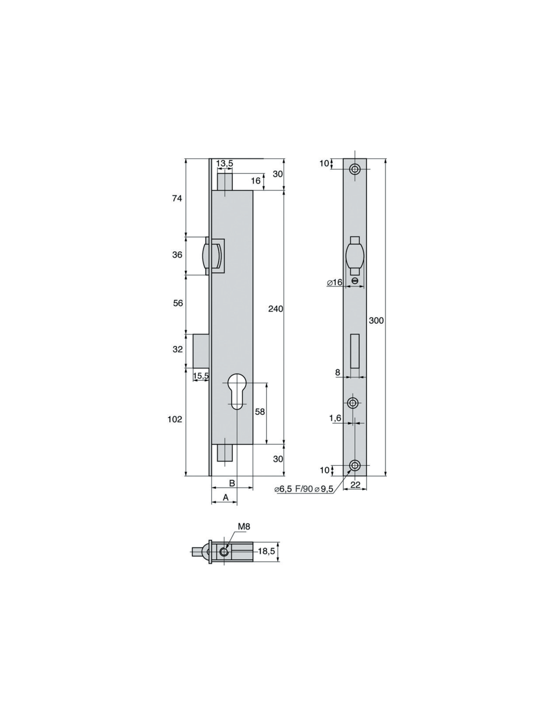 Pêne dormant et rouleau • Serrure à larder 3 points pour cylindre européen panneton DIN